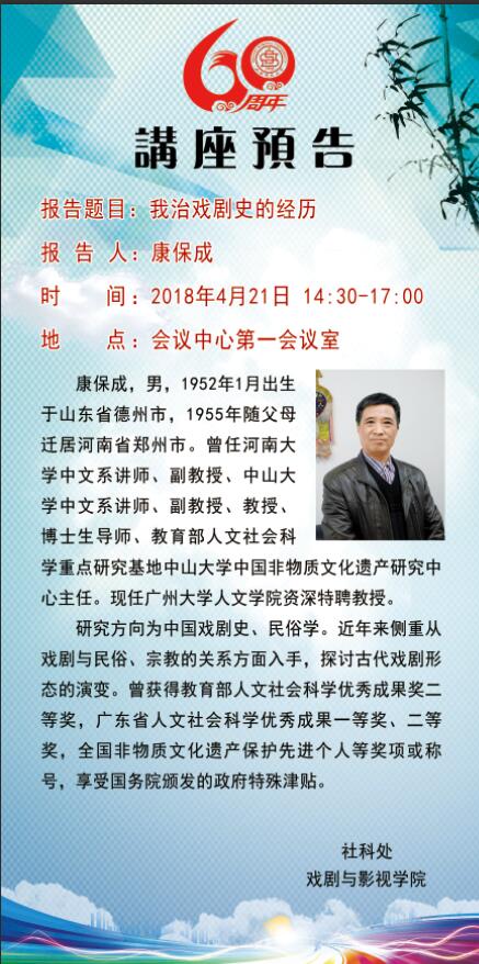 【预告】广州大学康保成教授应戏剧与影视学院邀请来永利官网作学术报告