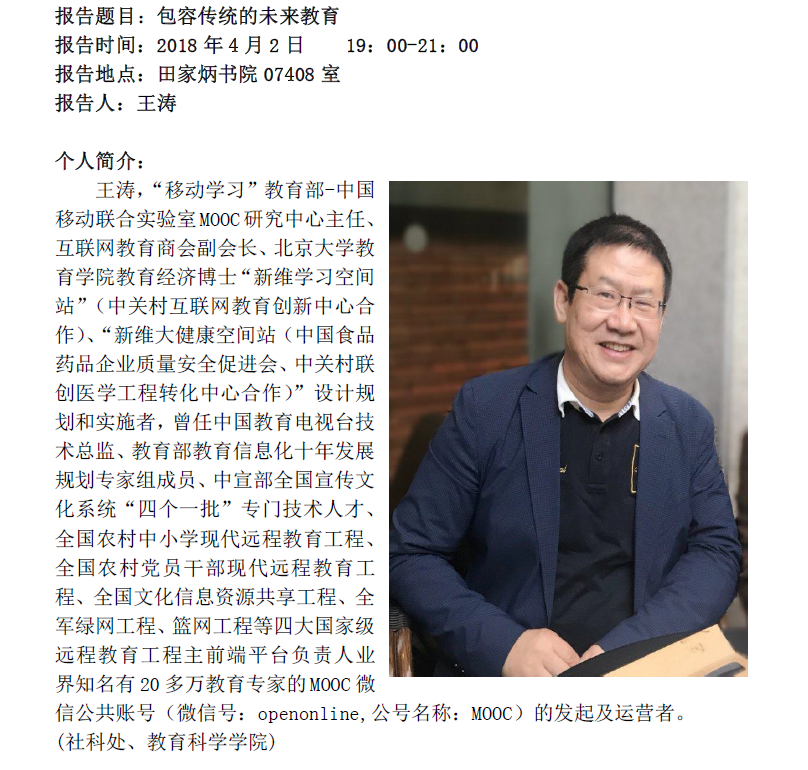【预告】“移动学习”教育部-中国移动联合实验室MOOC研究中心主任王涛应教育科学学院邀请来永利官网作学术报告