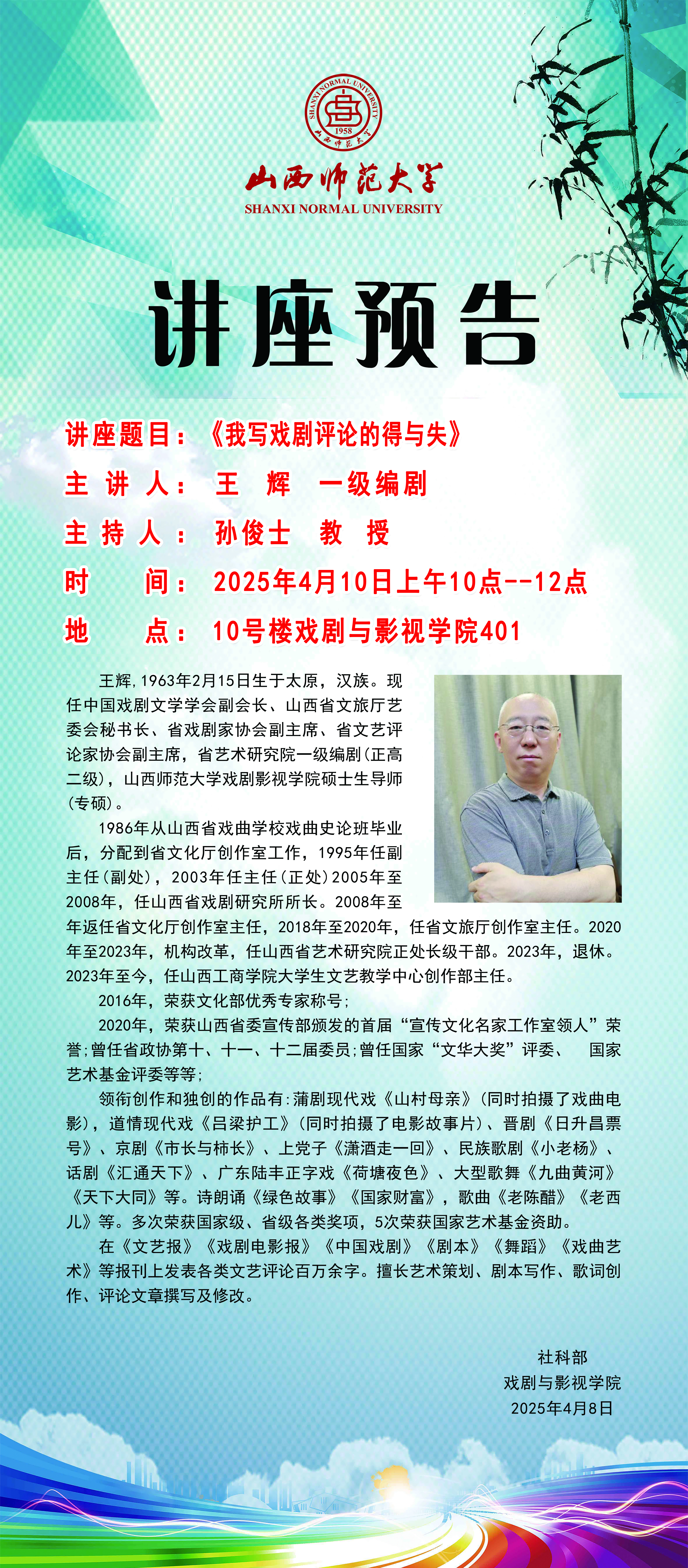 【预告】山西省艺术研究院一级编剧王辉应戏剧与影视学院邀请作学术报告