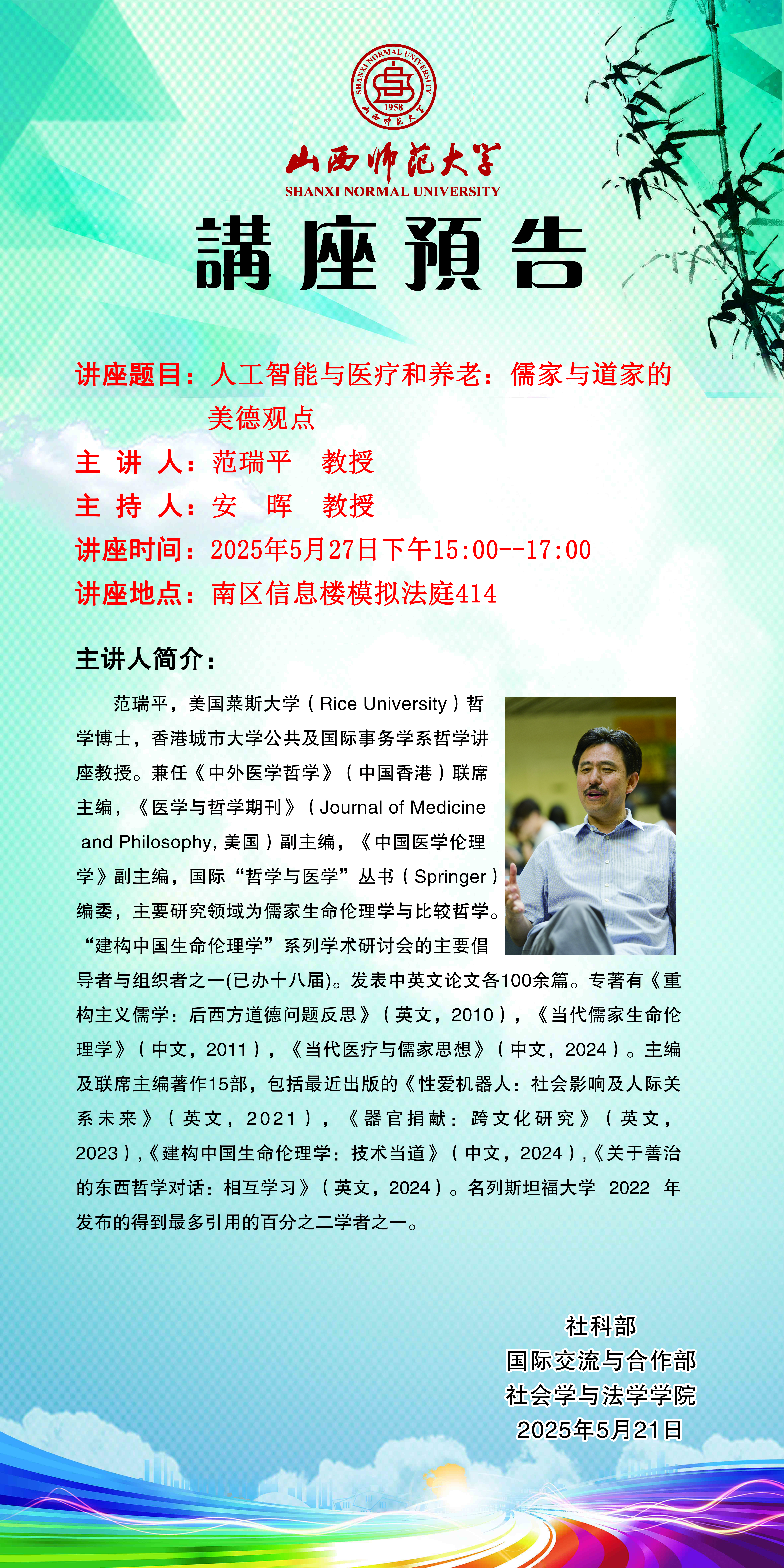 【预告】香港城市大学范瑞平教授应社会学与法学学院邀请做学术报告