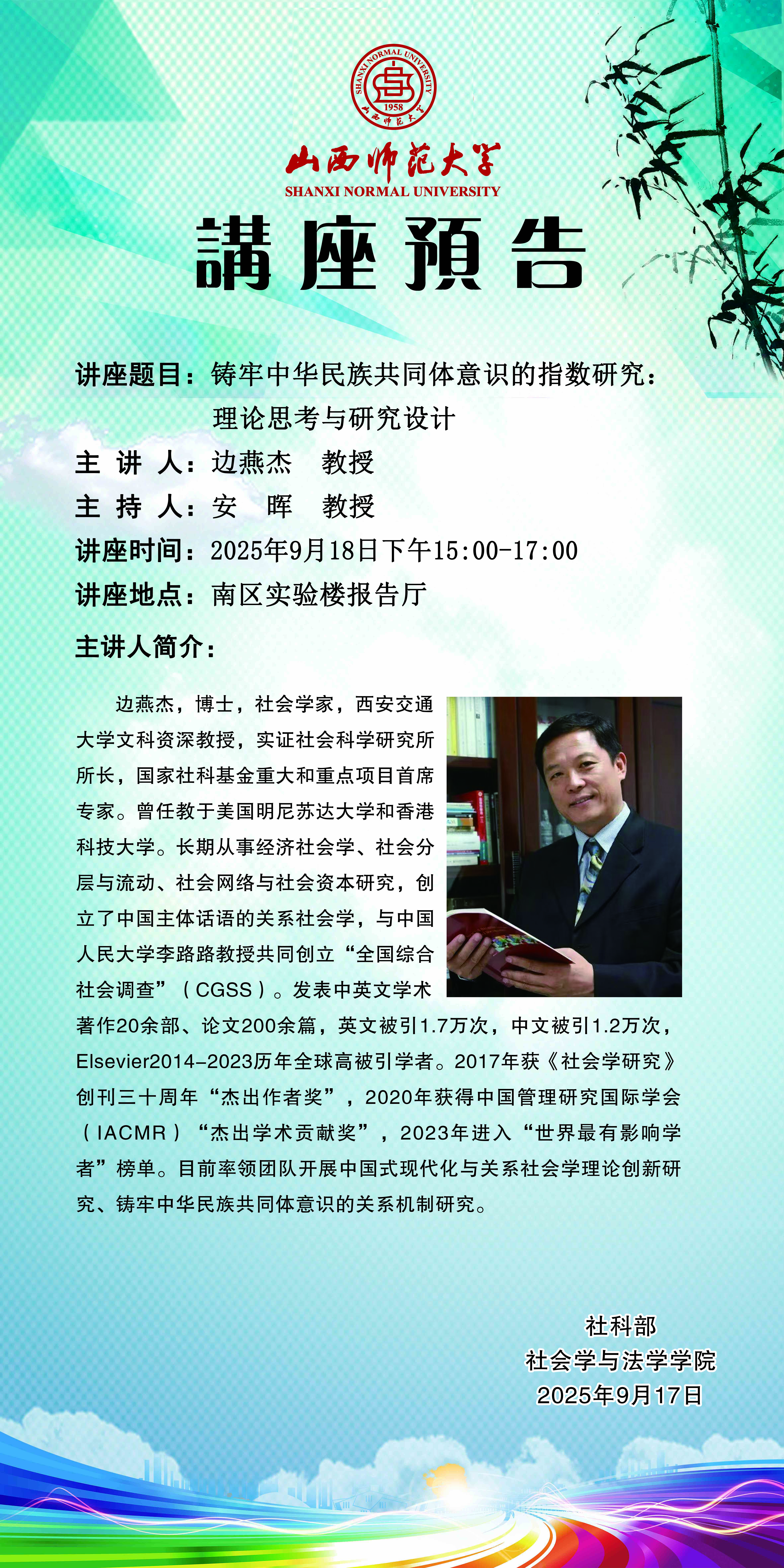 【预告】西安交通大学边燕杰教授应社会学与法学学院邀请作学术报告