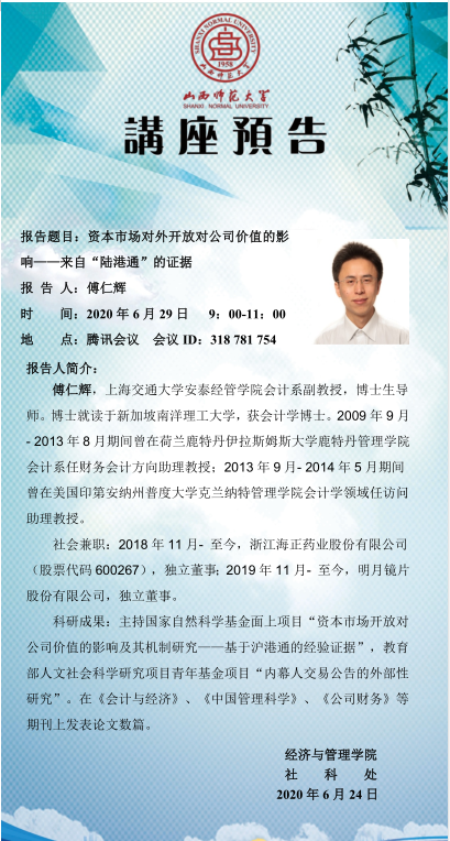 【预告】 上海交通大学傅仁辉副教授应经济与管理学院邀请举办视频直播讲座