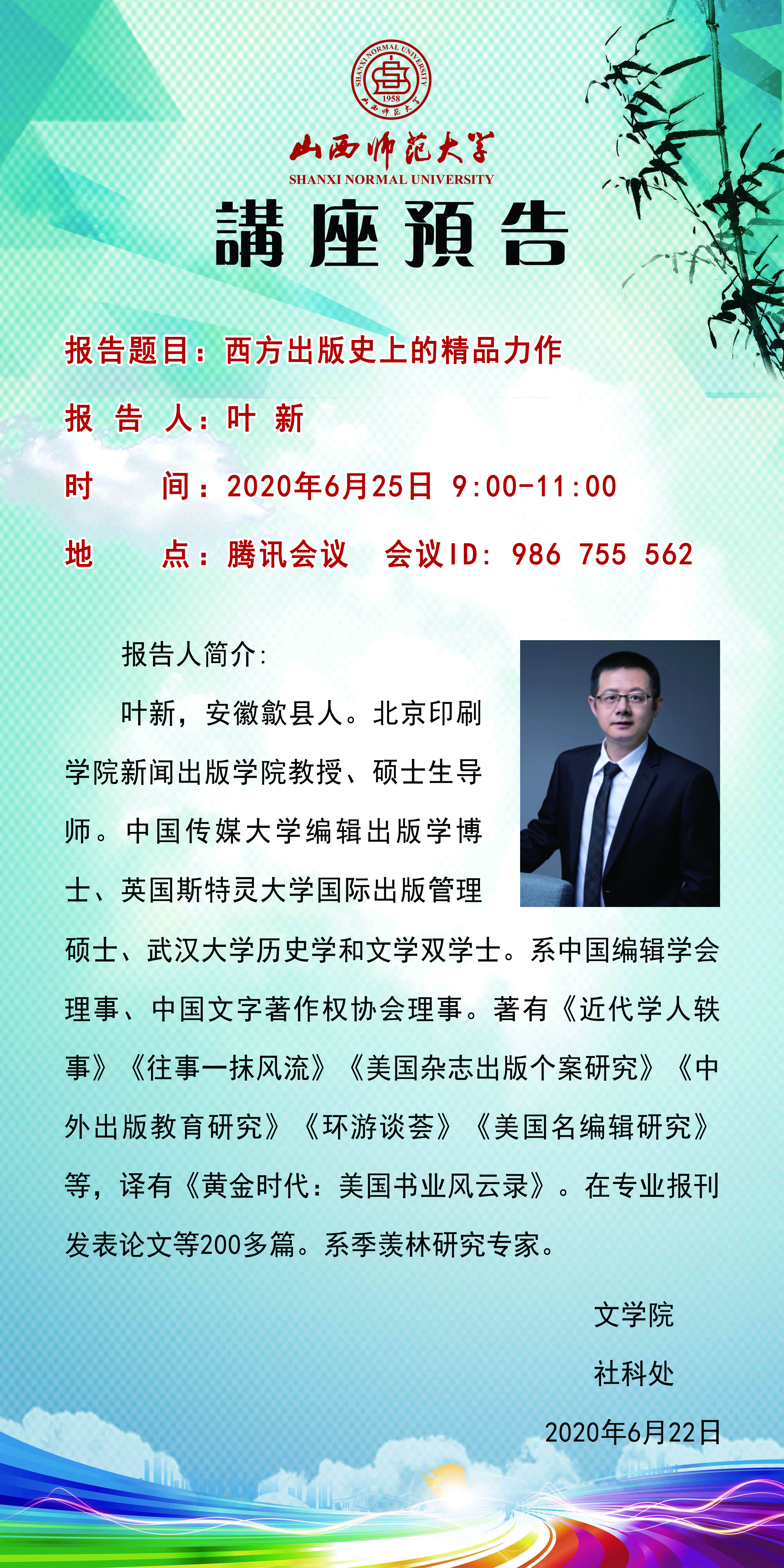 【预告】北京印刷学院叶新教授应文学院邀请举办视频直播讲座