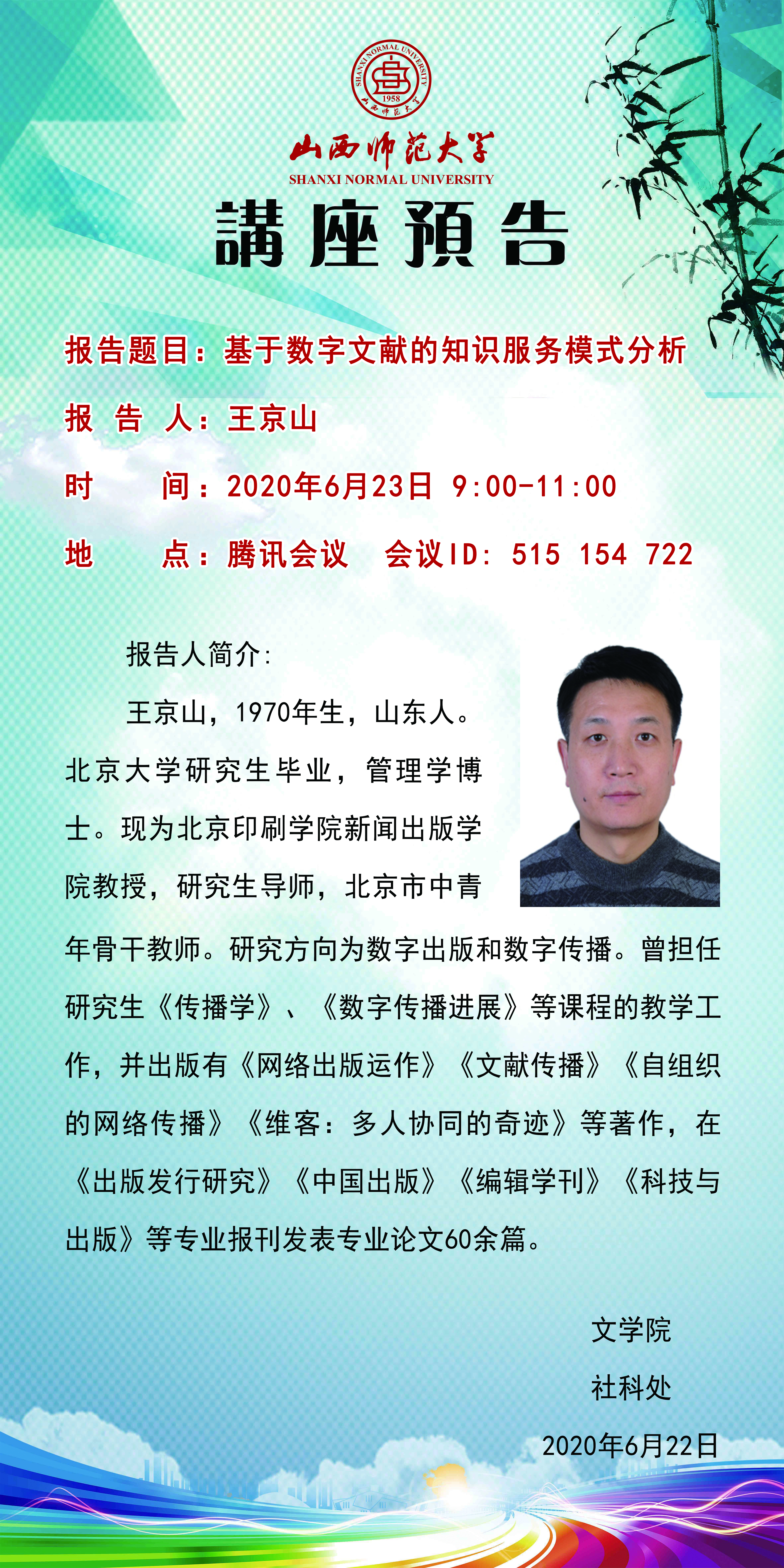 【预告】北京印刷学院王京山教授应文学院邀请举办视频直播讲座