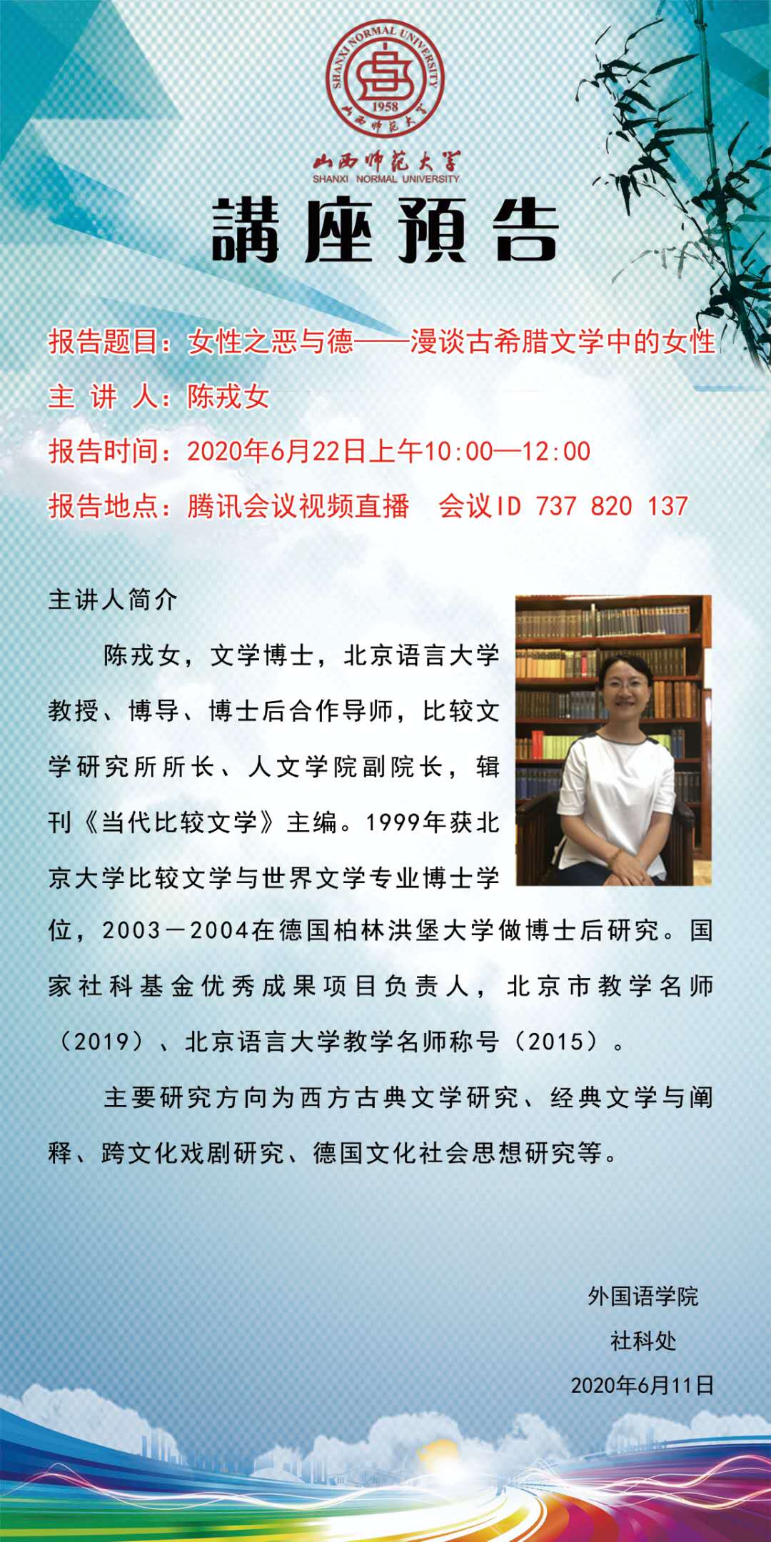 【预告】 北京语言大学陈戎女教授应外国语学院邀请做线上学术讲座
