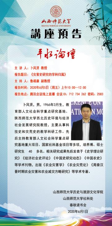 【预告】 陕西师范大学卜凤贤教授应历史与旅游文化学院邀请举办视频直播讲座