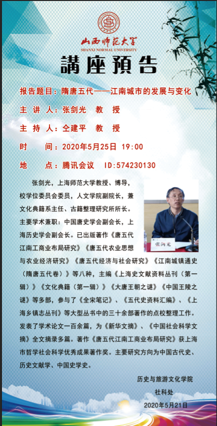 【预告】 上海师范大学张剑光教授应历史与旅游文化学院邀请举办视频直播讲座