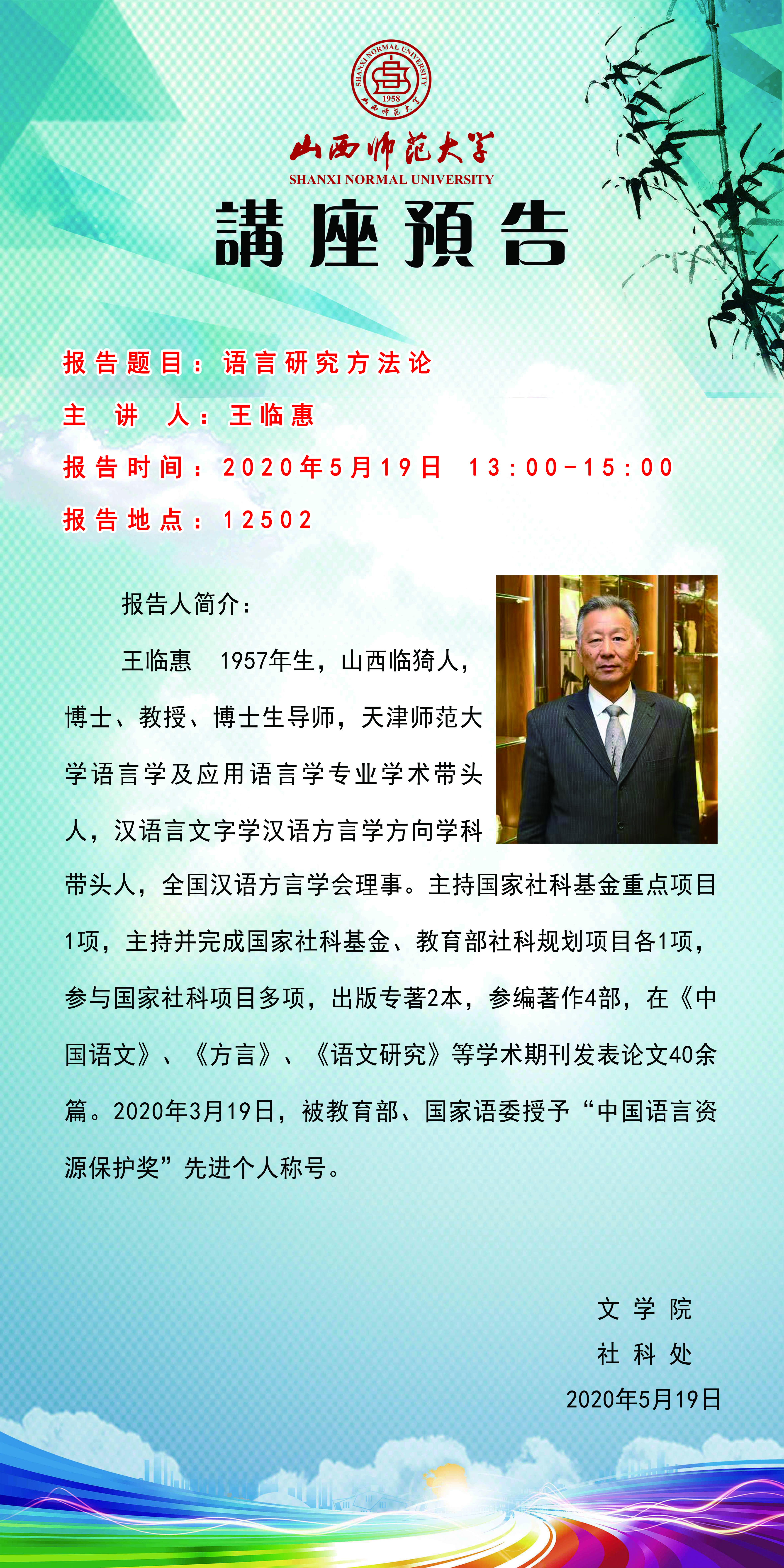 【预告】 天津师范大学王临惠教授应文学院邀请来永利官网作学术报告