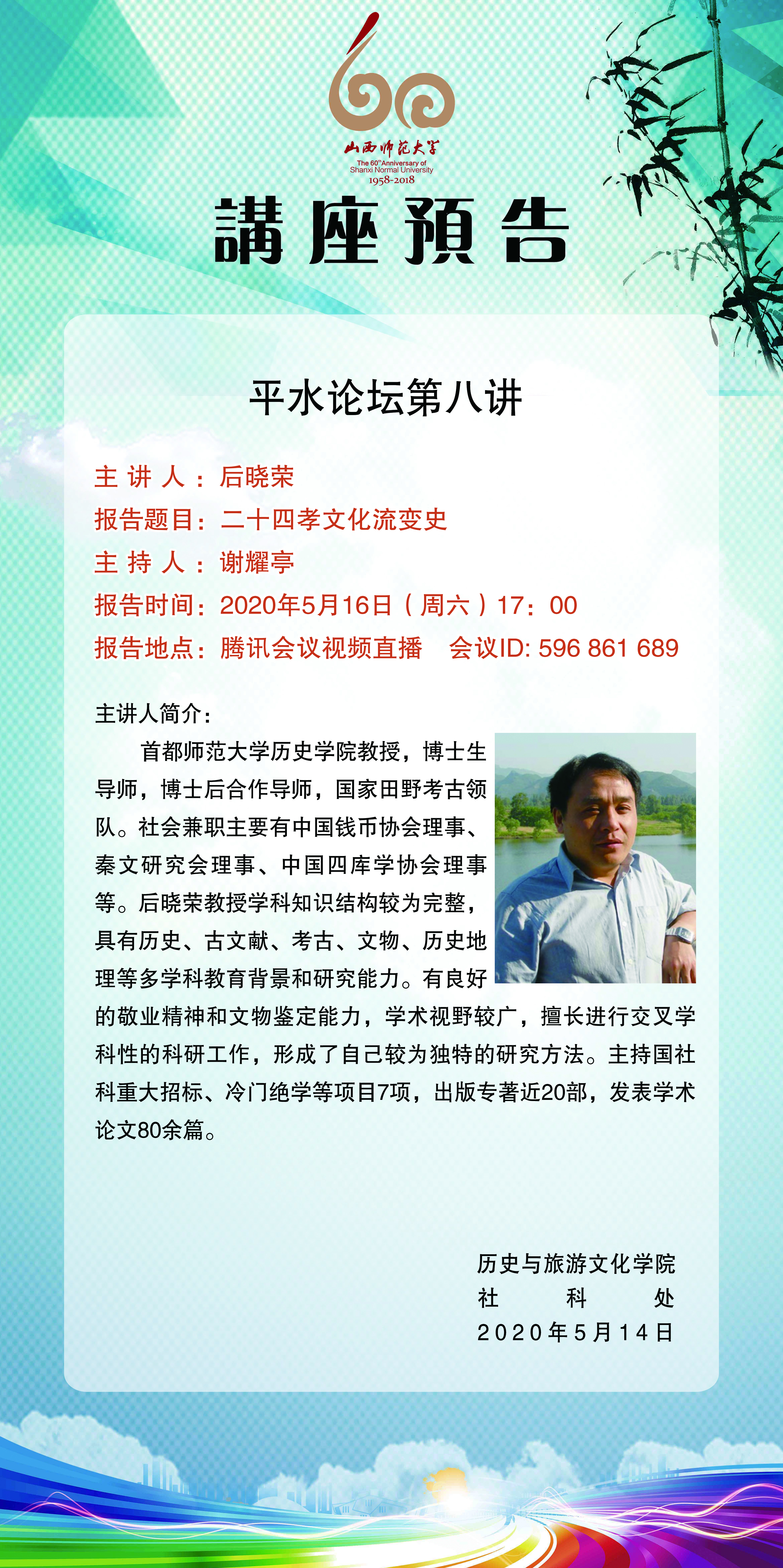 【预告】 首都师范大学后晓荣教授应历史与旅游文化学院邀请举办视频直播讲座