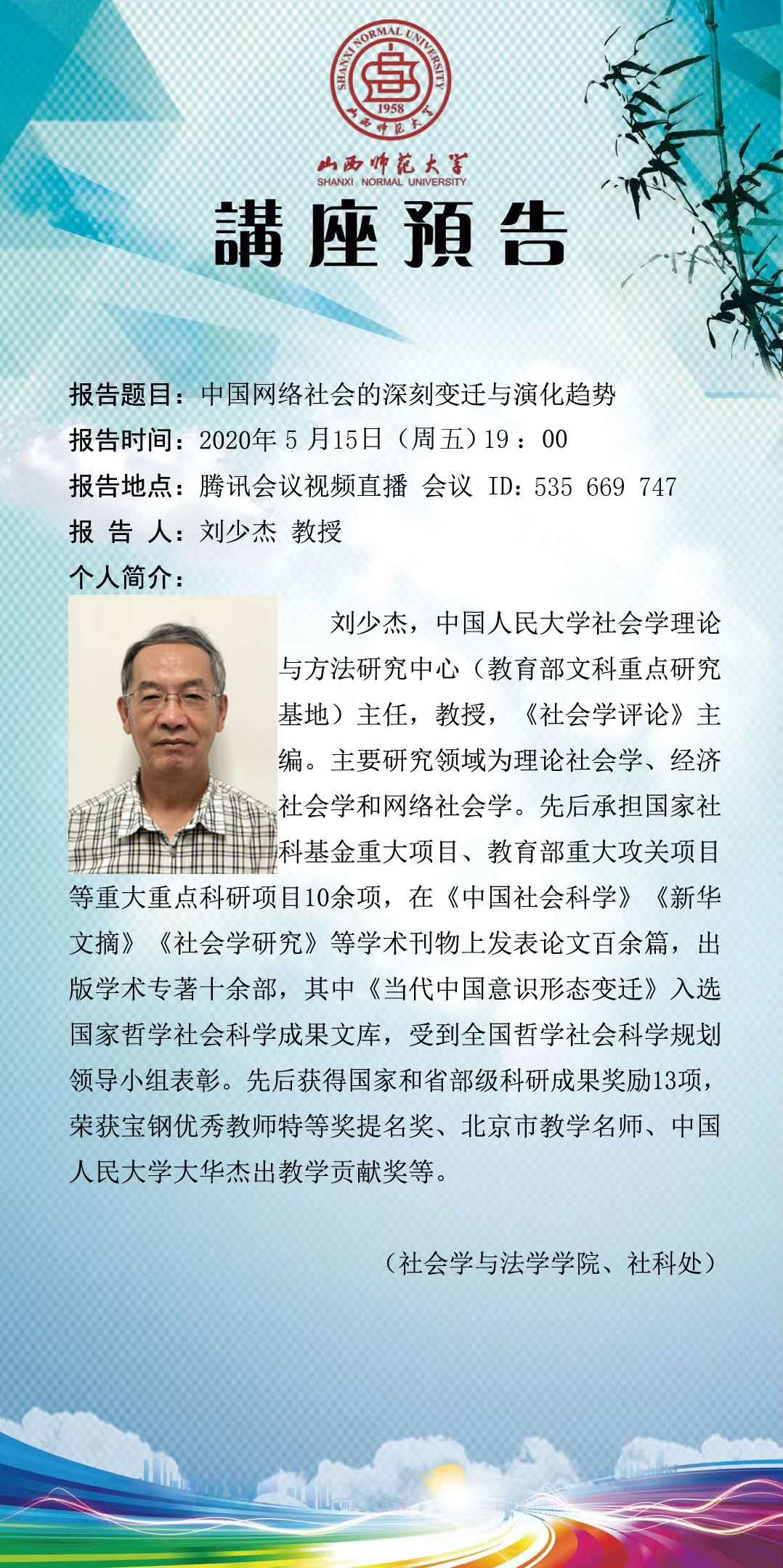 【预告】 中国人民大学社会学理论与方法研究中心主任刘少杰教授应社会学与法学学院邀请举办视频直播讲座