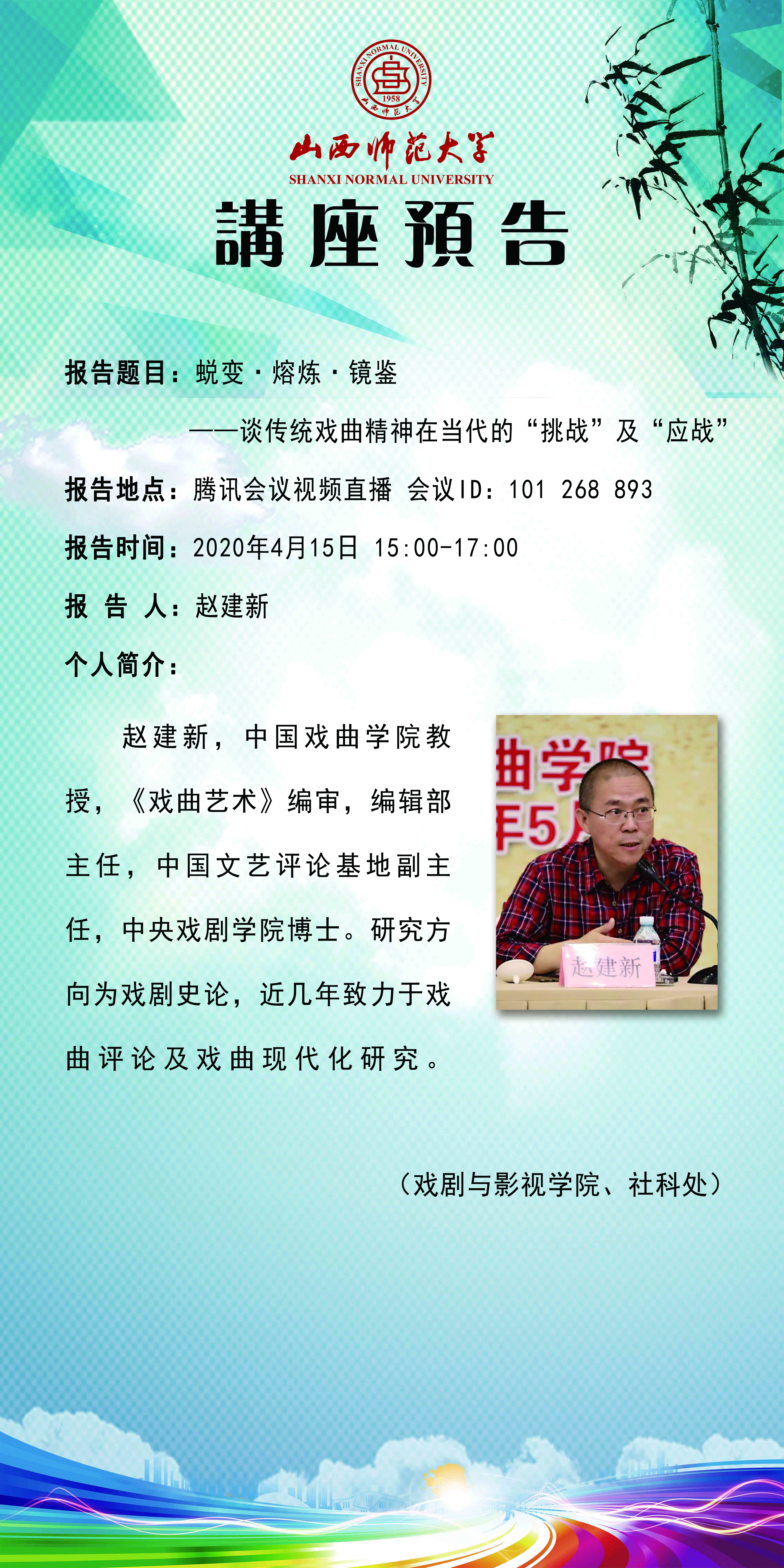 【预告】 中国戏曲学院赵建新教授应戏剧与影视学院邀请举办视频直播讲座