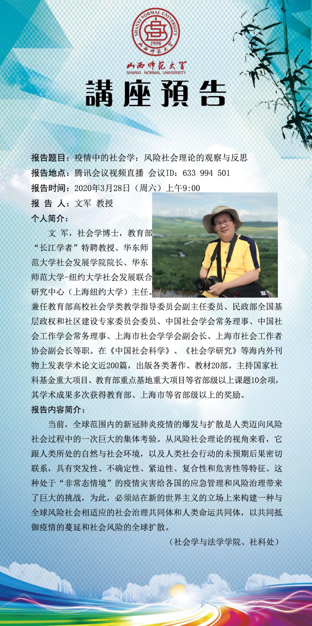 【预告】 教育部“长江学者”特聘教授、华东师范大学社会发展学院文军院长应社会学与法学学院邀请举办视频直播讲座