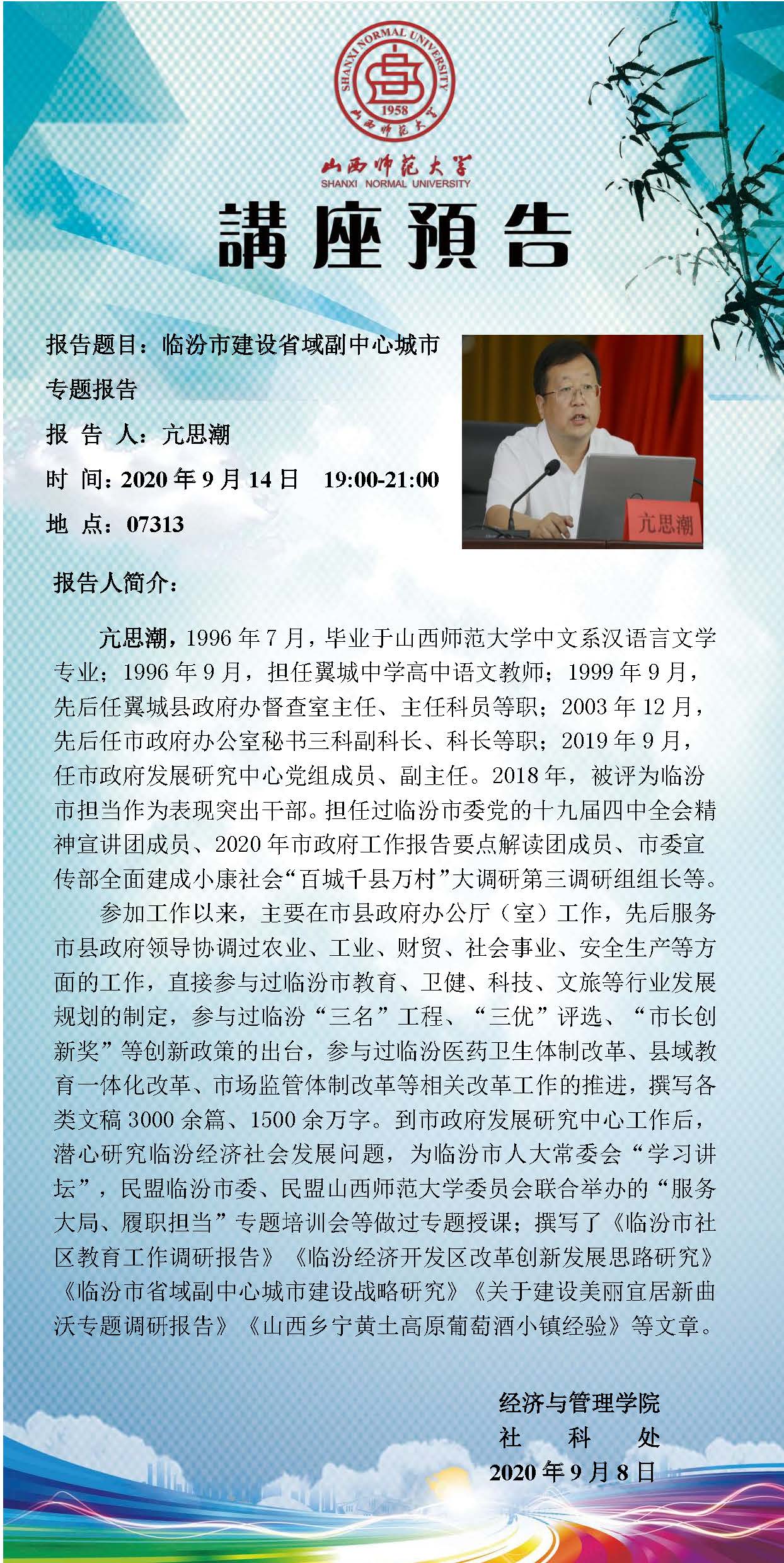 【预告】 临汾市政府发展研究中心副主任亢思潮应经济与管理学院邀请来永利官网作专题报告