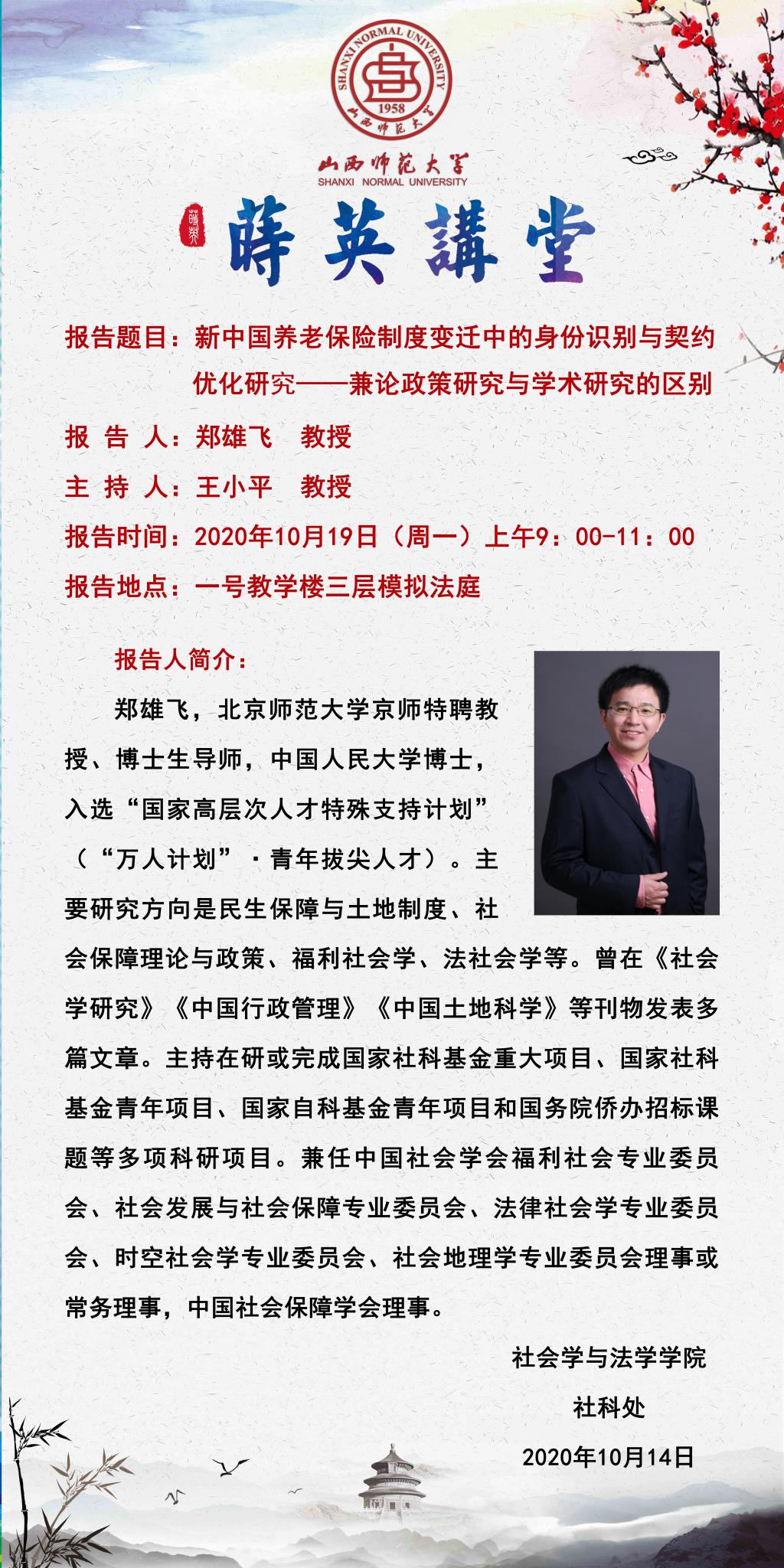 【预告】【莳英讲堂】 北京师范大学京师特聘教授郑雄飞应社会学与法学学院邀请来永利官网作学术报告