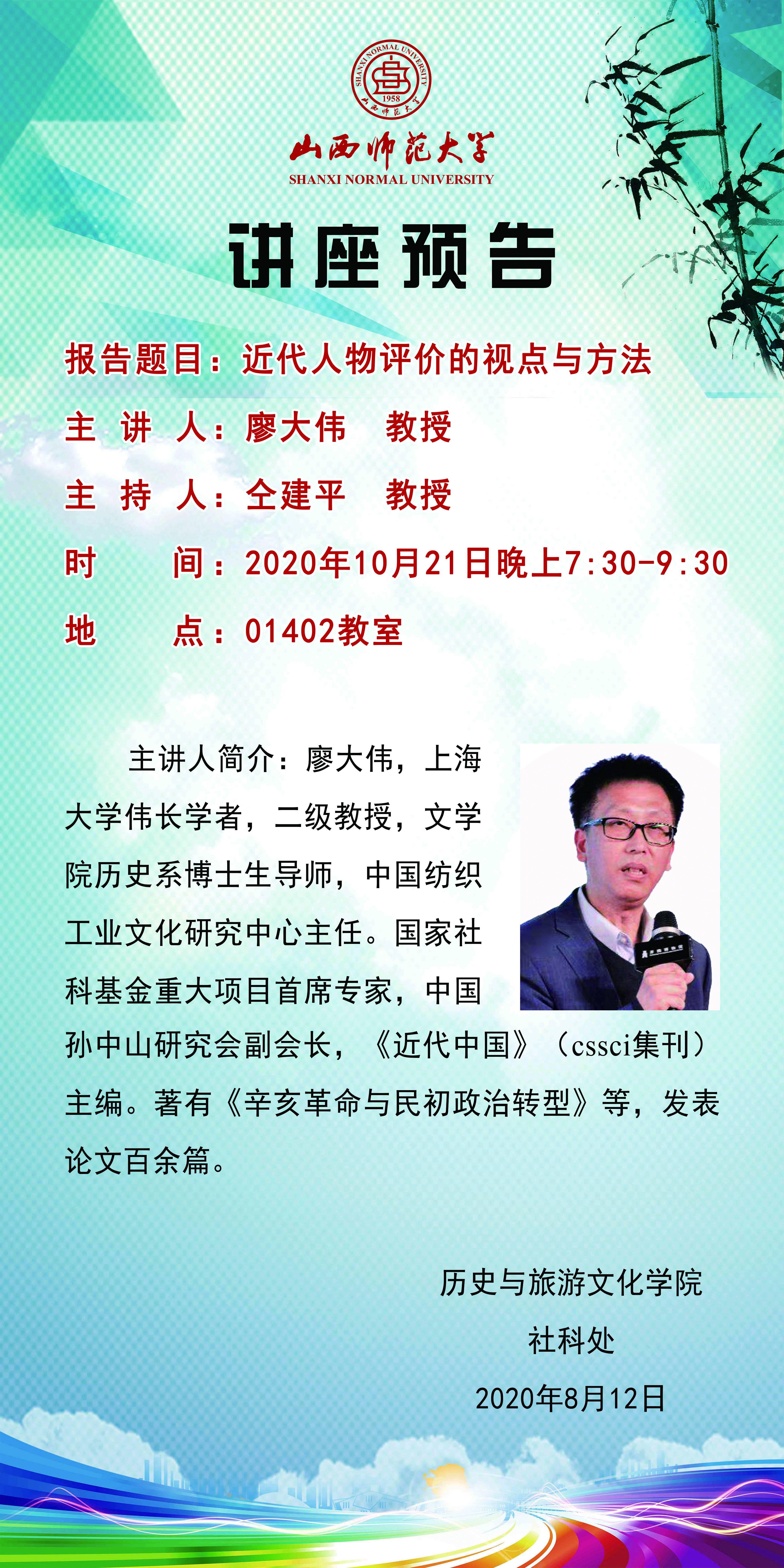 【预告】 上海师范大学廖大伟教授应历史与旅游文化学院邀请来永利官网作学术报告