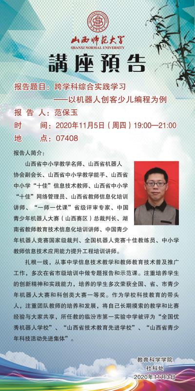 【预告】山西省中小学教学名师、山西省机器人协会副会长范保玉应教育科学学院邀请来永利官网作学术报告