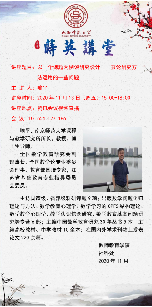 【预告】【莳英讲堂】南京师范大学喻平教授应教师教育学院邀请作线上学术报告