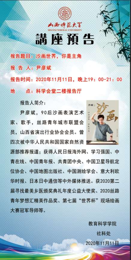 【预告】山西省演出行业协会会员、90后沙画表演艺术家尹彦斌老师应教育科学学院邀请作学术报告