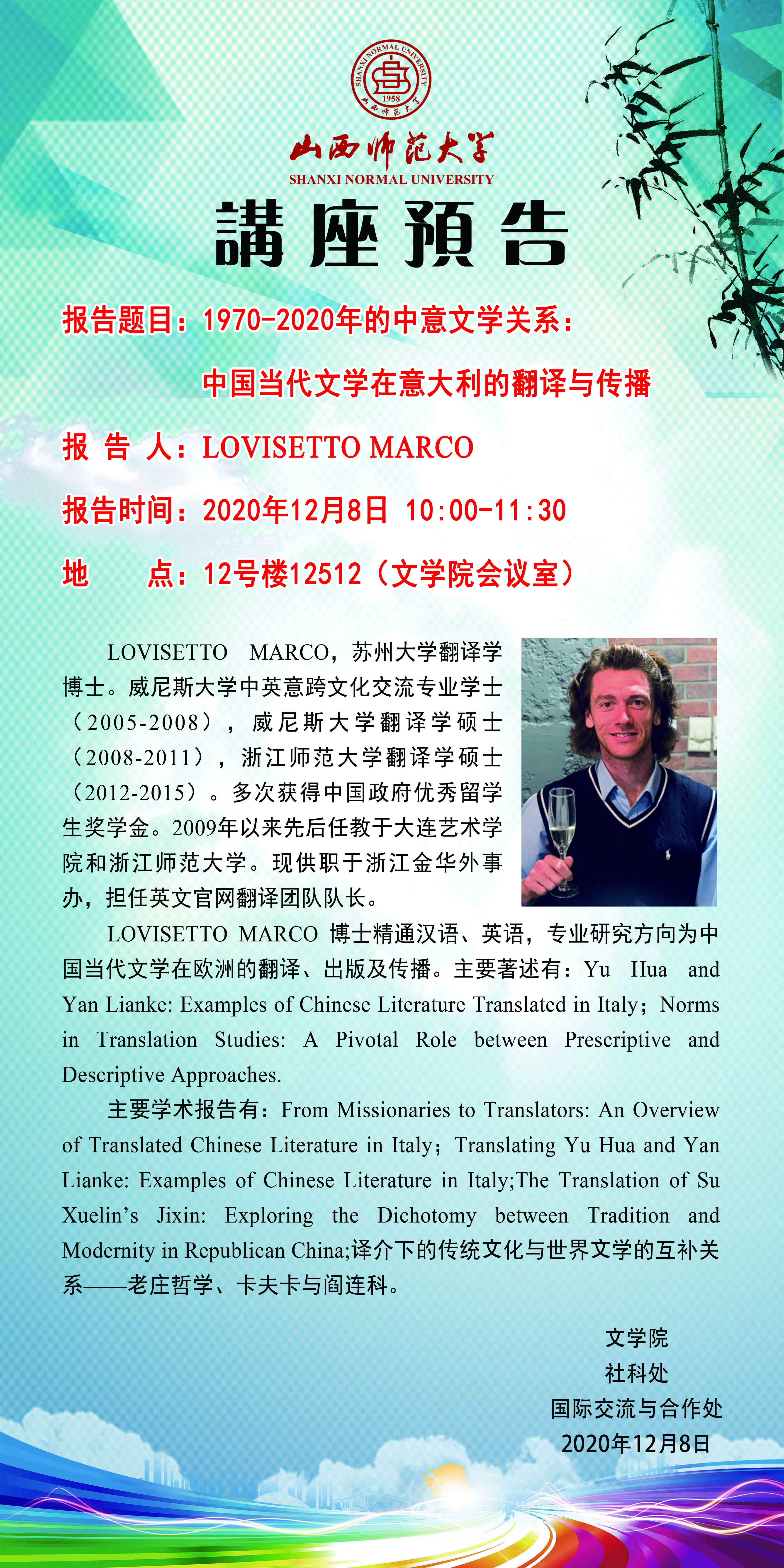 【预告】 苏州大学博士Marco Lovisetto应文学院邀请来永利官网作学术报告