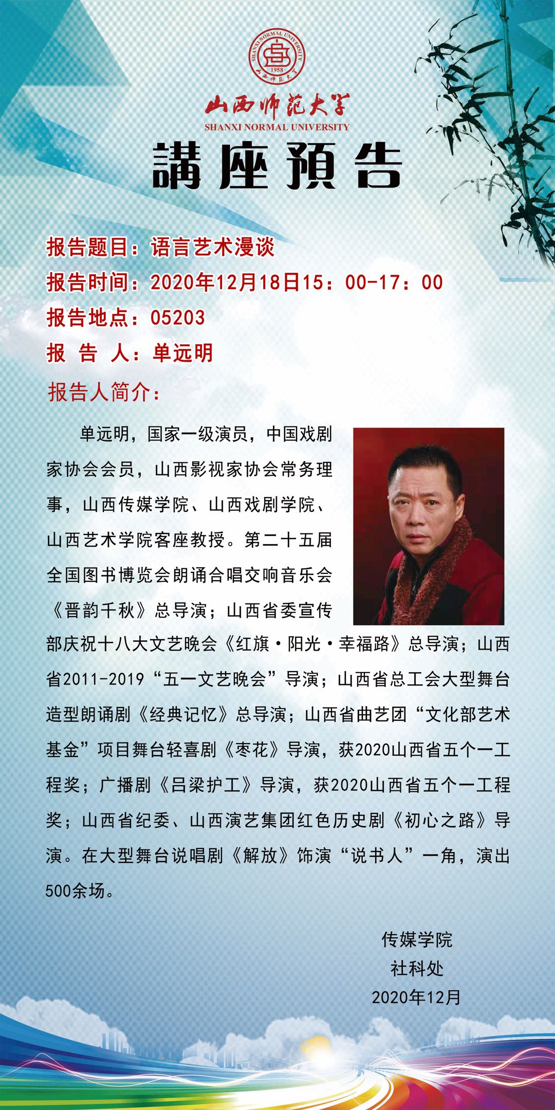 【预告】山西省话剧院单远明应传媒学院邀请作学术报告