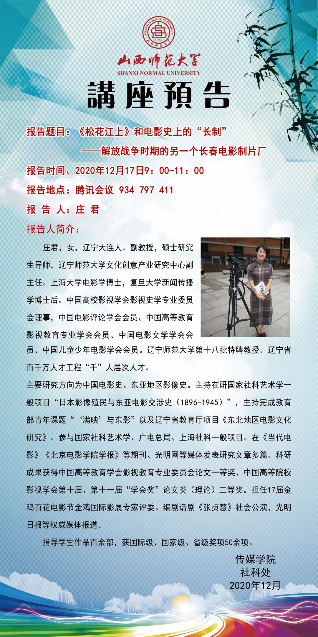 【预告】 辽宁师范大学庄君副教授应传媒学院邀请作线上学术报告