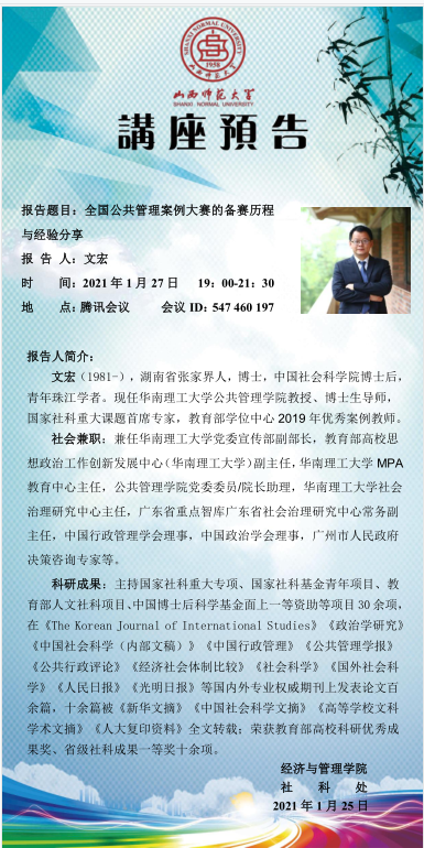 【预告】华南理工大学文宏教授应经济与管理学院邀请作线上学术报告