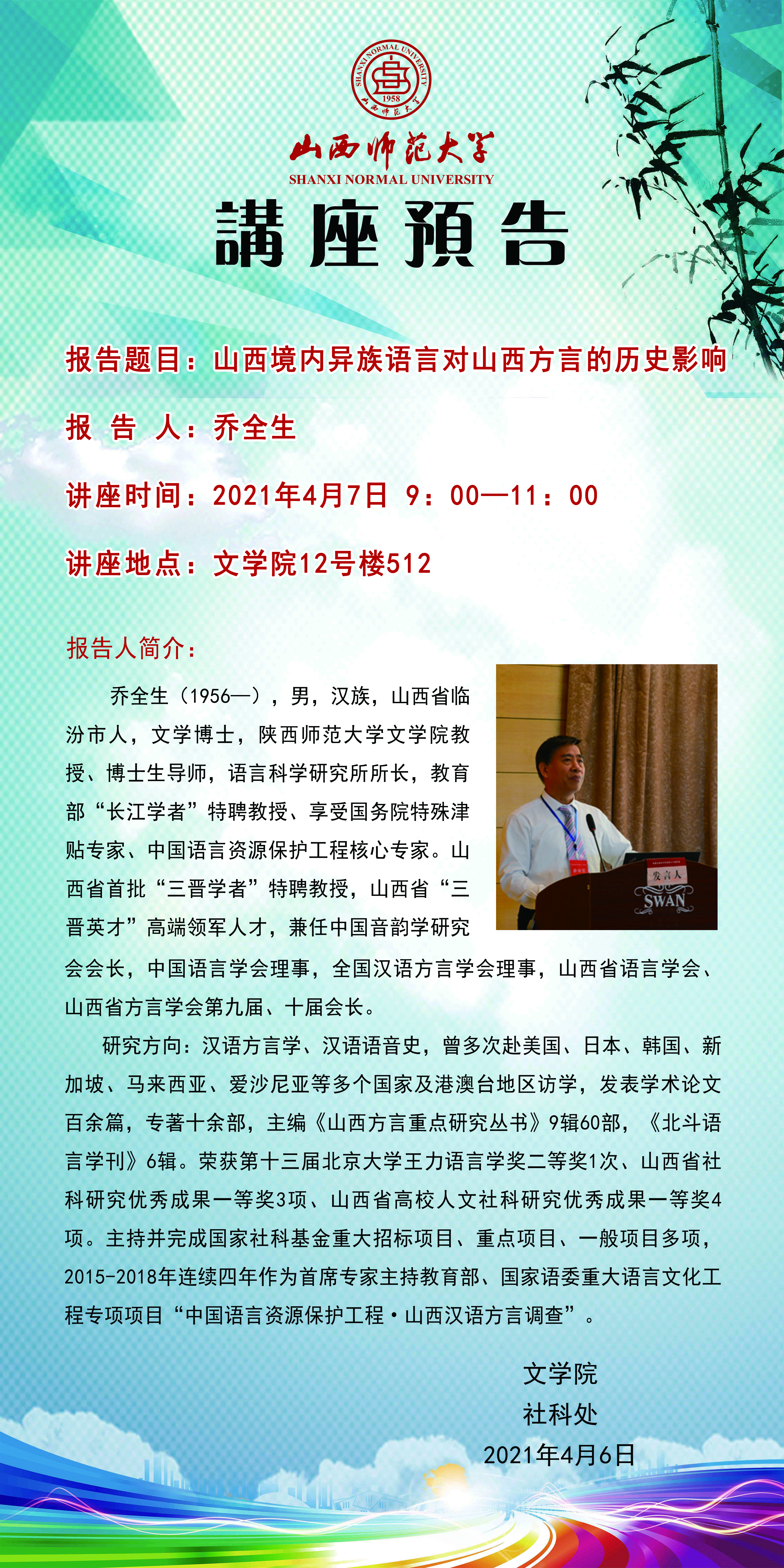 【预告】陕西师范大学乔全生教授应文学院邀请来永利官网作学术报告