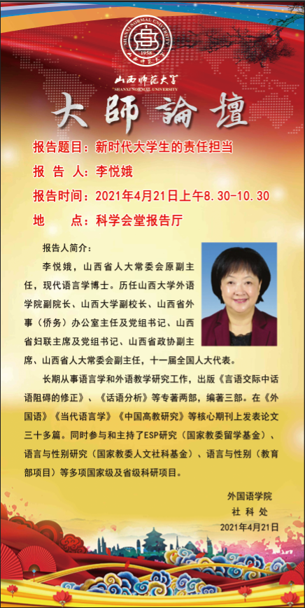 【预告】山西省人大常委会原副主任李悦娥教授应外国语学院邀请来永利官网作学术报告