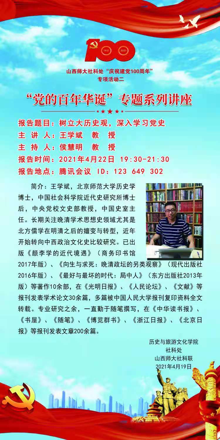 【预告】“党的百年华诞”专题系列讲座四:树立大历史观,深入学习党史