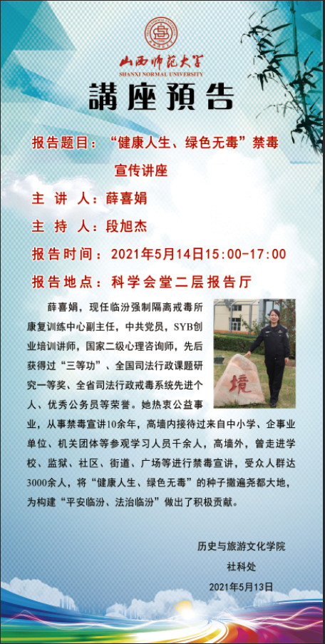 【预告】历史与旅游文化学院举办“健康人生,绿色无毒”禁毒宣传讲座