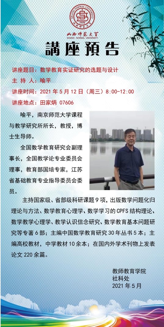 【预告】南京师范大学课程与教学研究所所长喻平教授应教师教育学院邀请来永利官网作学术报告