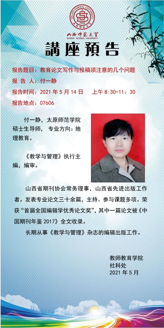 【预告】《教学与管理》杂志付一静编审应教师教育学院邀请来永利官网作学术报告
