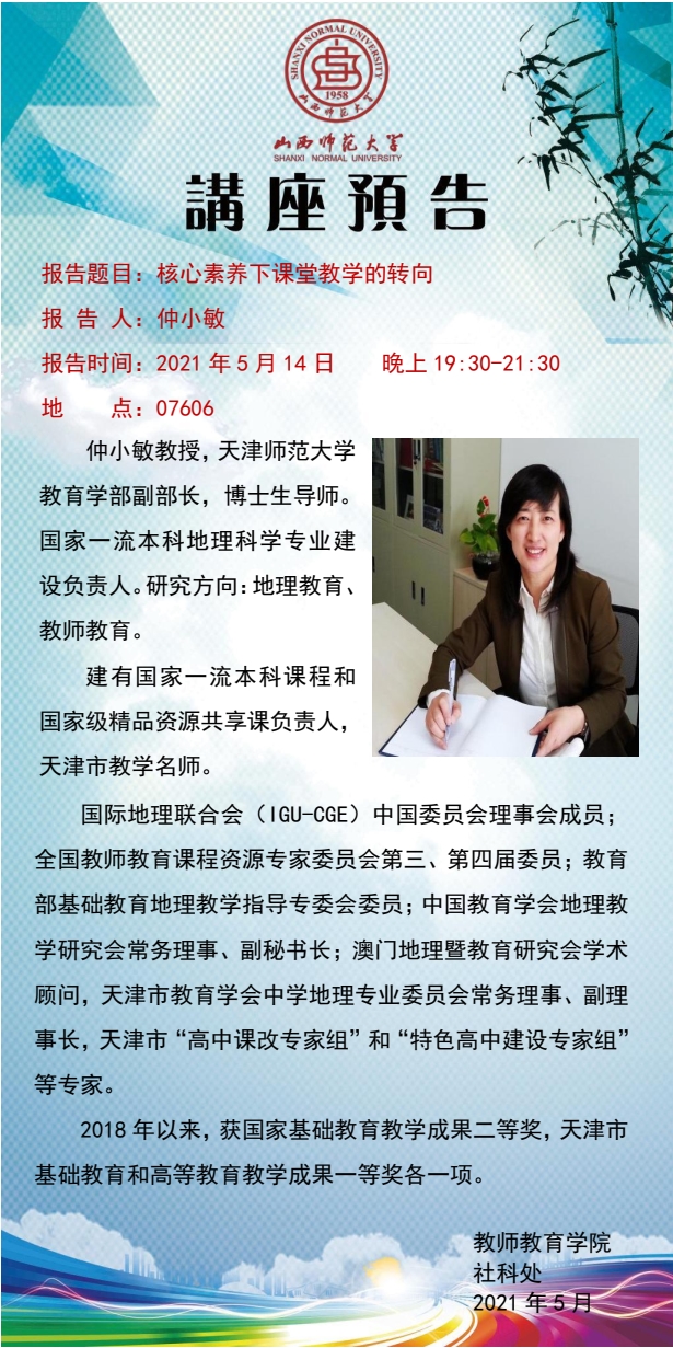 【预告】天津师范大学教育学部副部长仲小敏教授应教师教育学院邀请来永利官网作学术报告