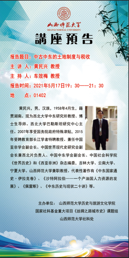 【预告】西北大学中东研究所黄民兴教授应历史与旅游文化学院邀请来永利官网作学术报告