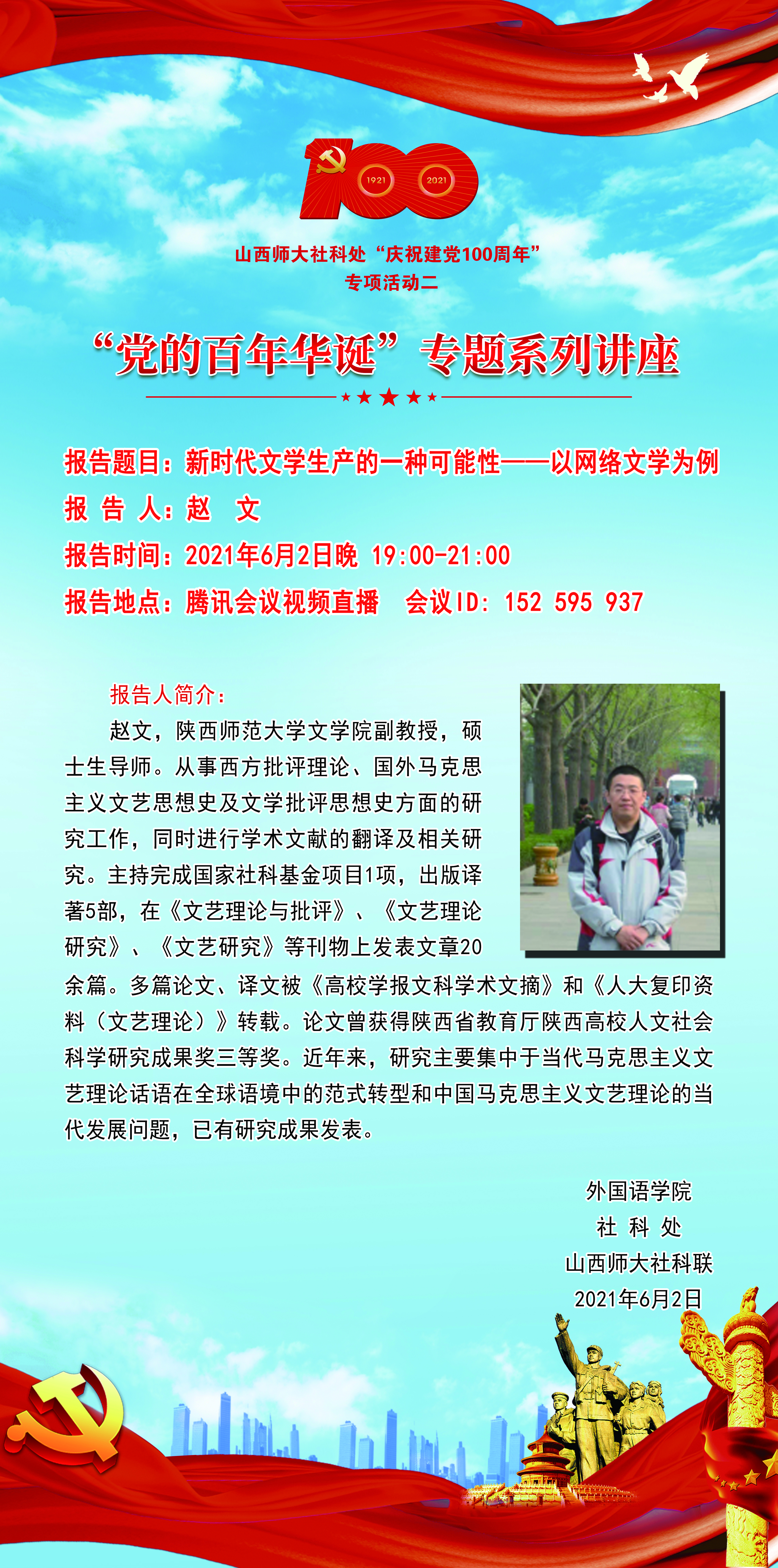 【预告】“党的百年华诞”专题系列讲座九:新时代文学生产的一种可能性—以网络文学为例
