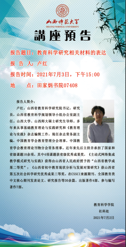 【预告】 山西省教育科学研究院卢红书记应教育科学学院邀请来永利官网作学术报告