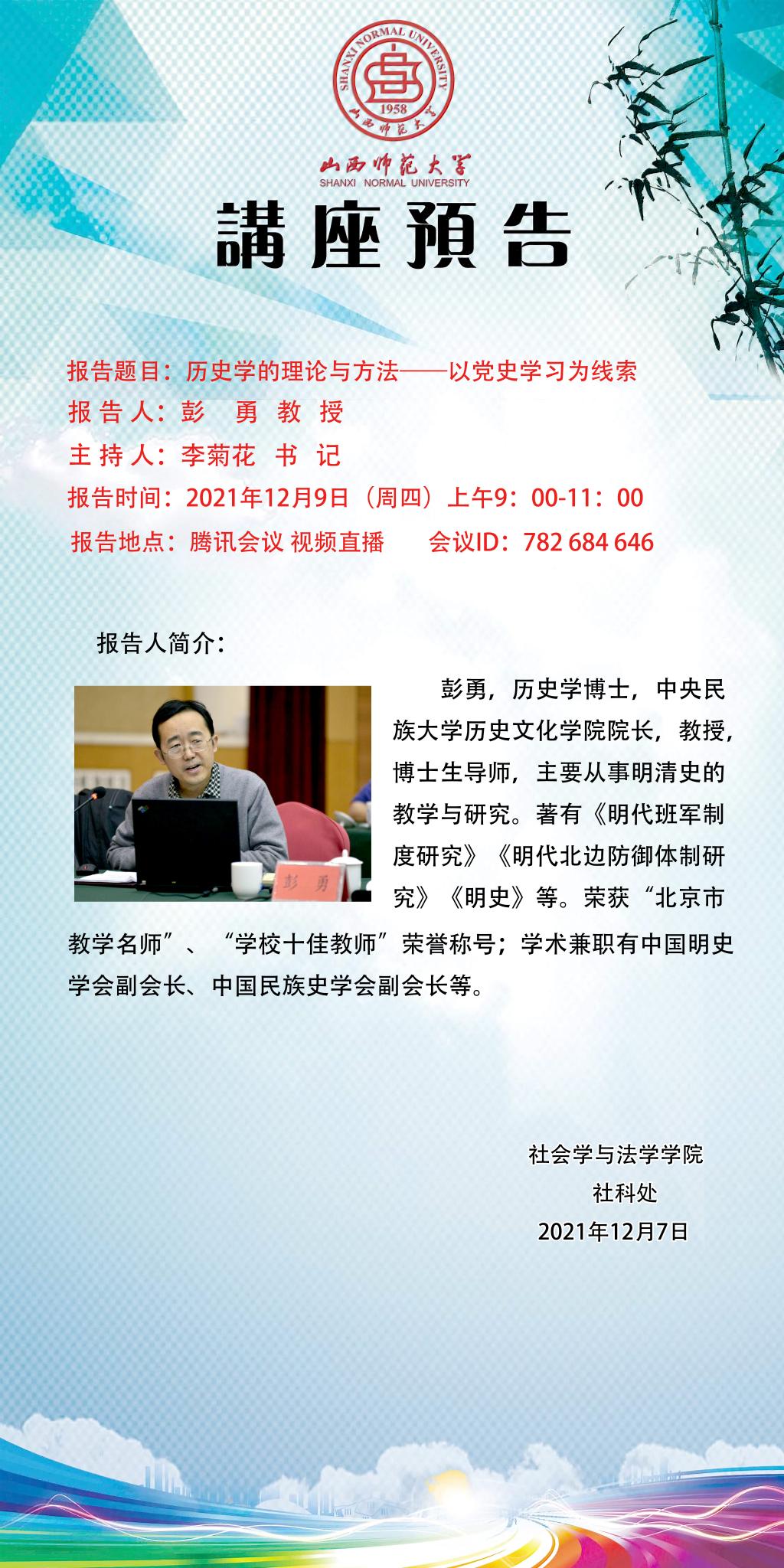 【预告】 中央民族大学历史文化学院院长彭勇教授应社会学与法学学院邀请作线上学术报告