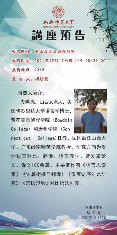 【预告】胡明亮教授应外国语学院邀请来永利官网作学术报告