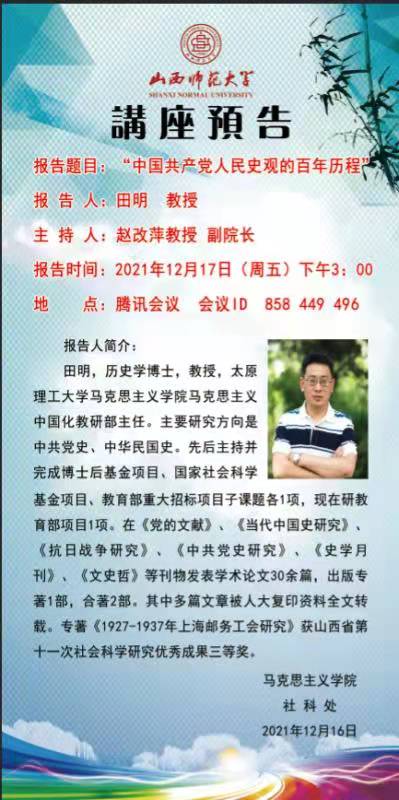 【预告】 太原理工大学田明教授应马克思主义学院邀请作线上学术报告