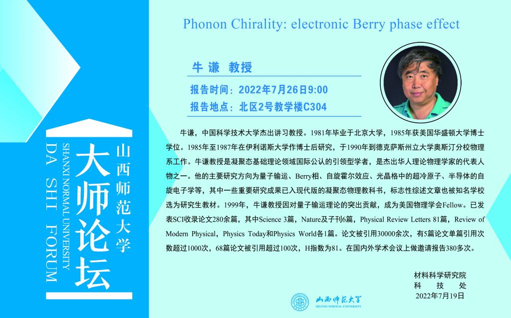 【预告】大师论坛-中国科学技术大学牛谦教授应永利官网邀请作学术报告