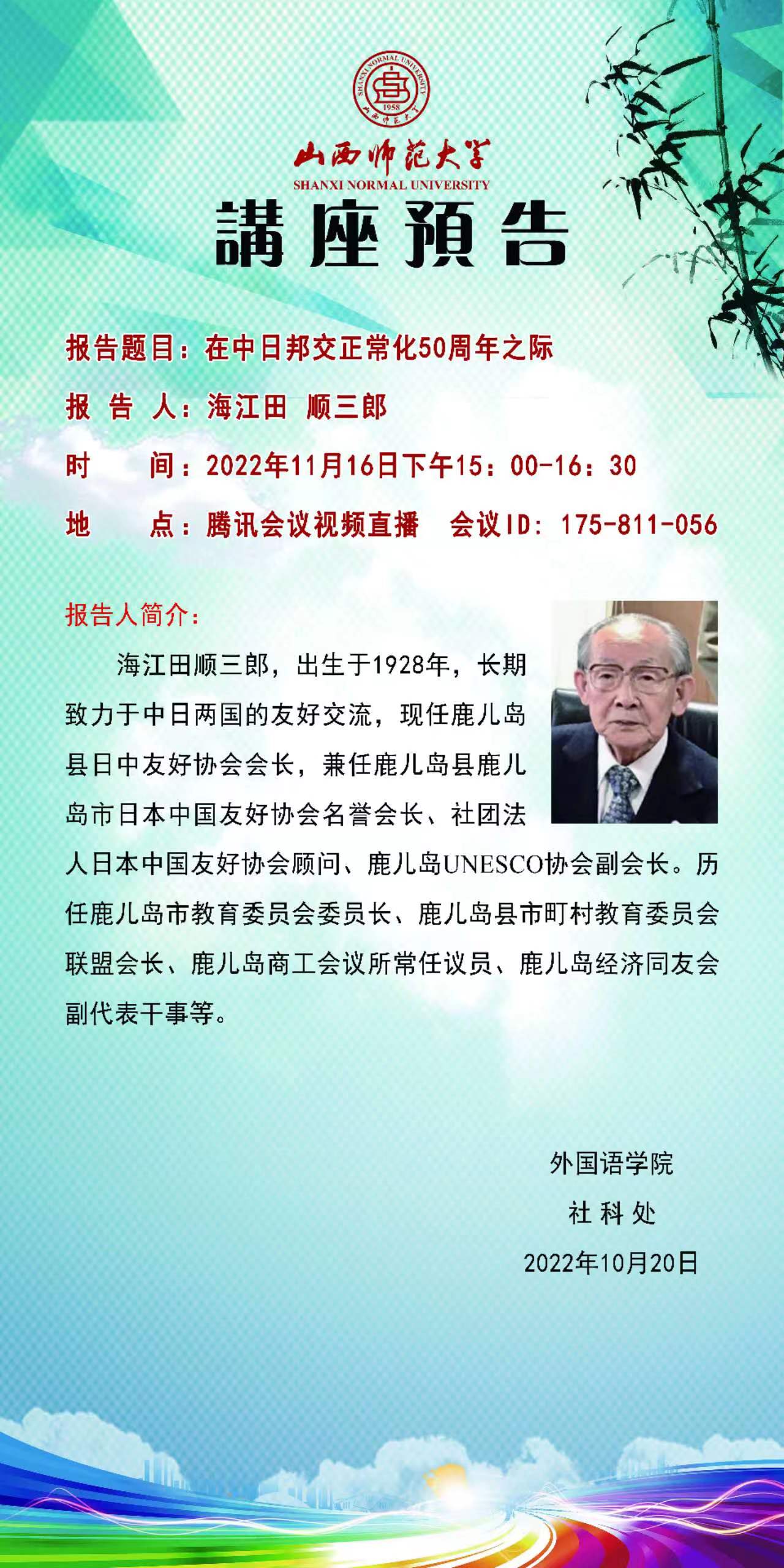 【预告】日本鹿儿岛县日中友好协会海江田顺三郎会长应永利官网邀请做线上学术报告