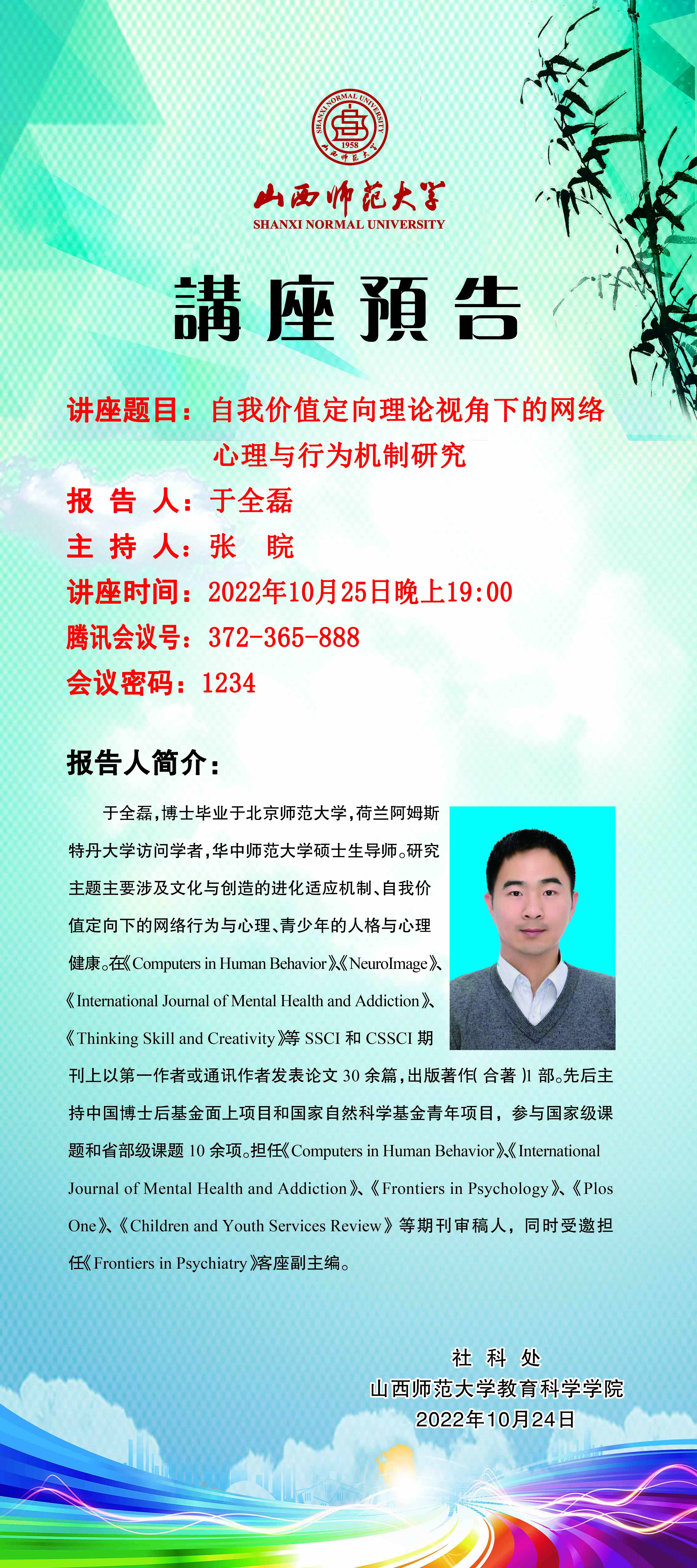 【预告】华中师范大学于全磊教授应永利官网邀请做线上学术报告