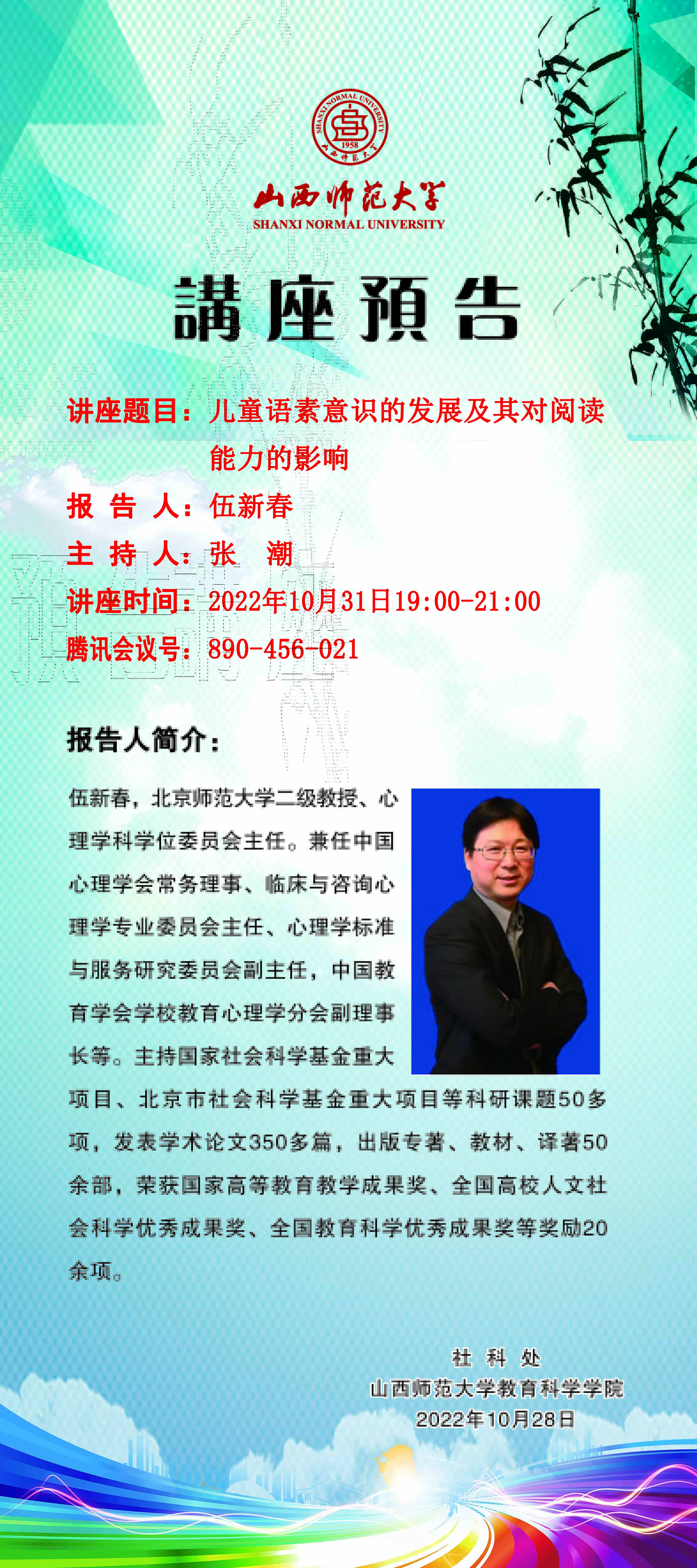 【预告】北京师范大学伍新春教授应永利官网教育科学学院邀请做线上学术报告
