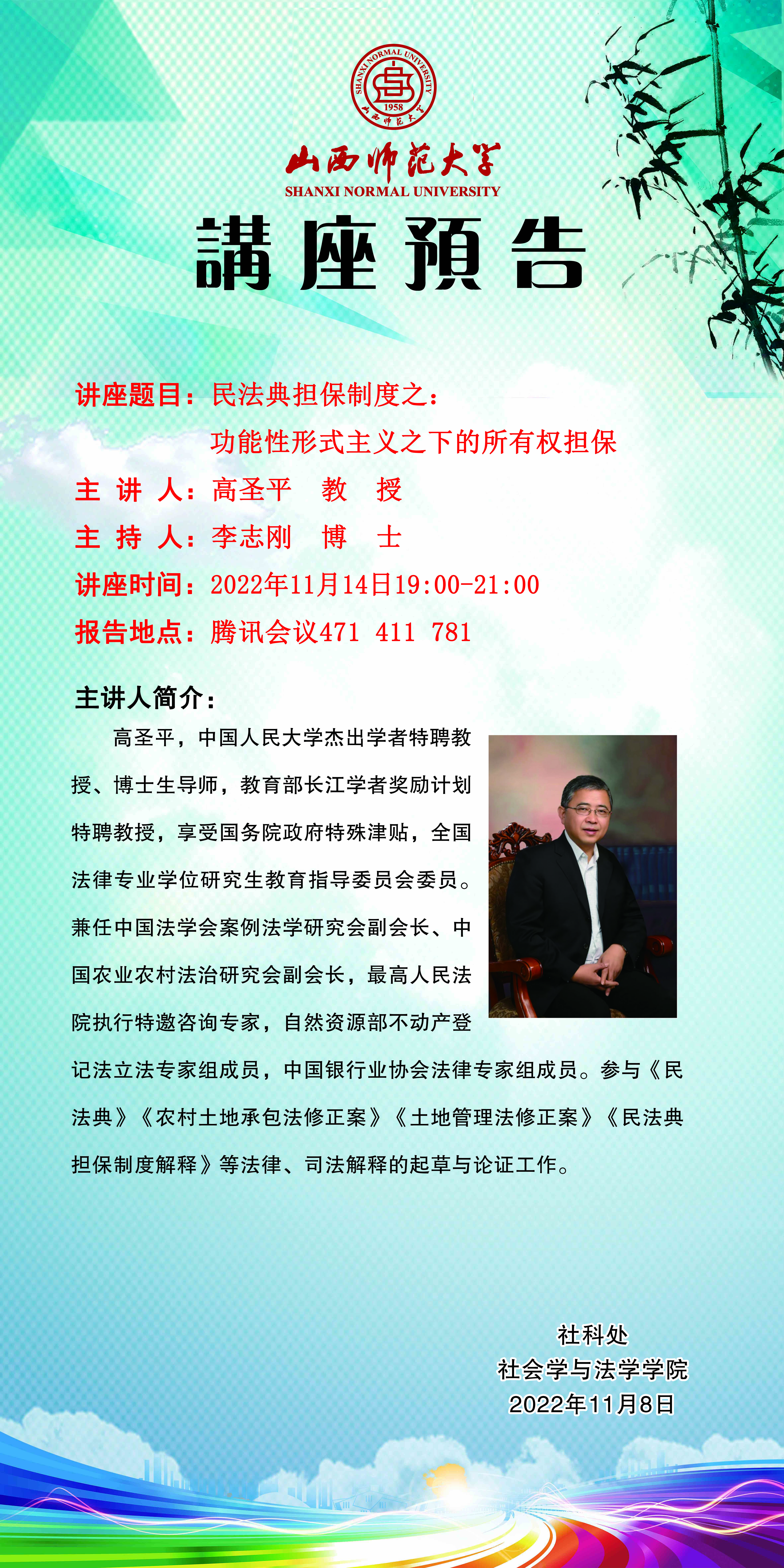 【预告】中国人民大学教授高圣平应永利官网社会学与法学学院邀请作线上学术报告