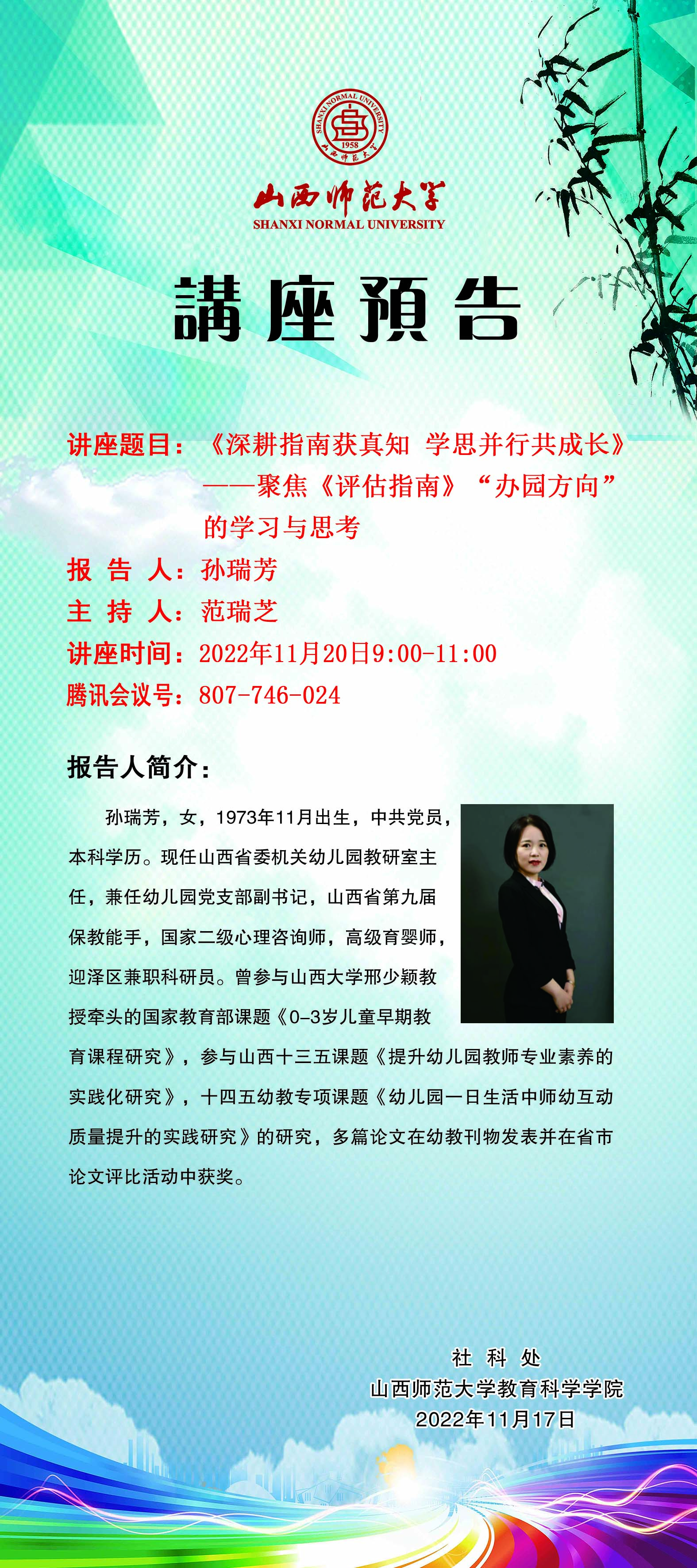 【预告】山西省委机关幼儿园教研室主任孙瑞芳应永利官网教育科学学院邀请作学术报告