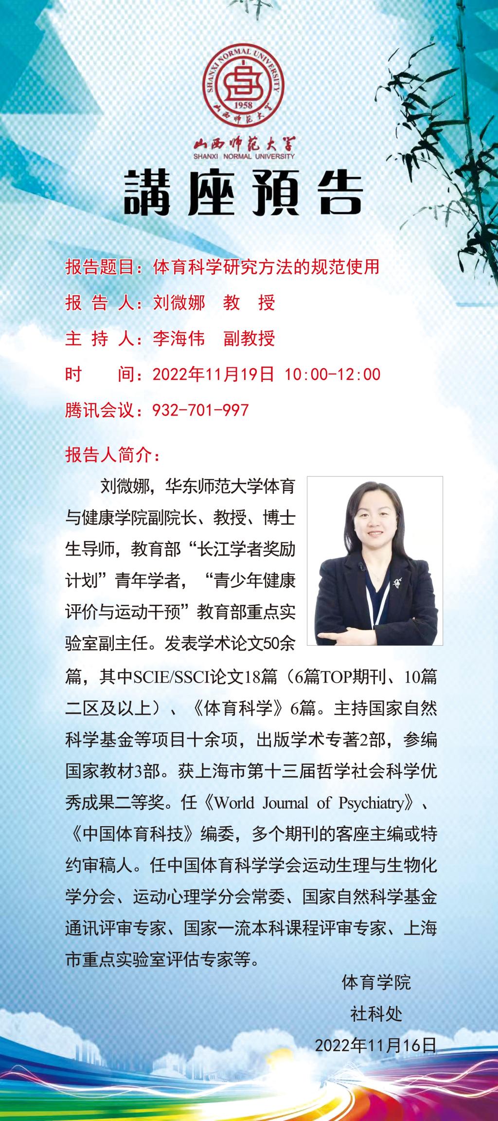 【预告】华东师范大学体育与健康学院刘微娜教授应永利官网体育学院邀请作线上学术报告