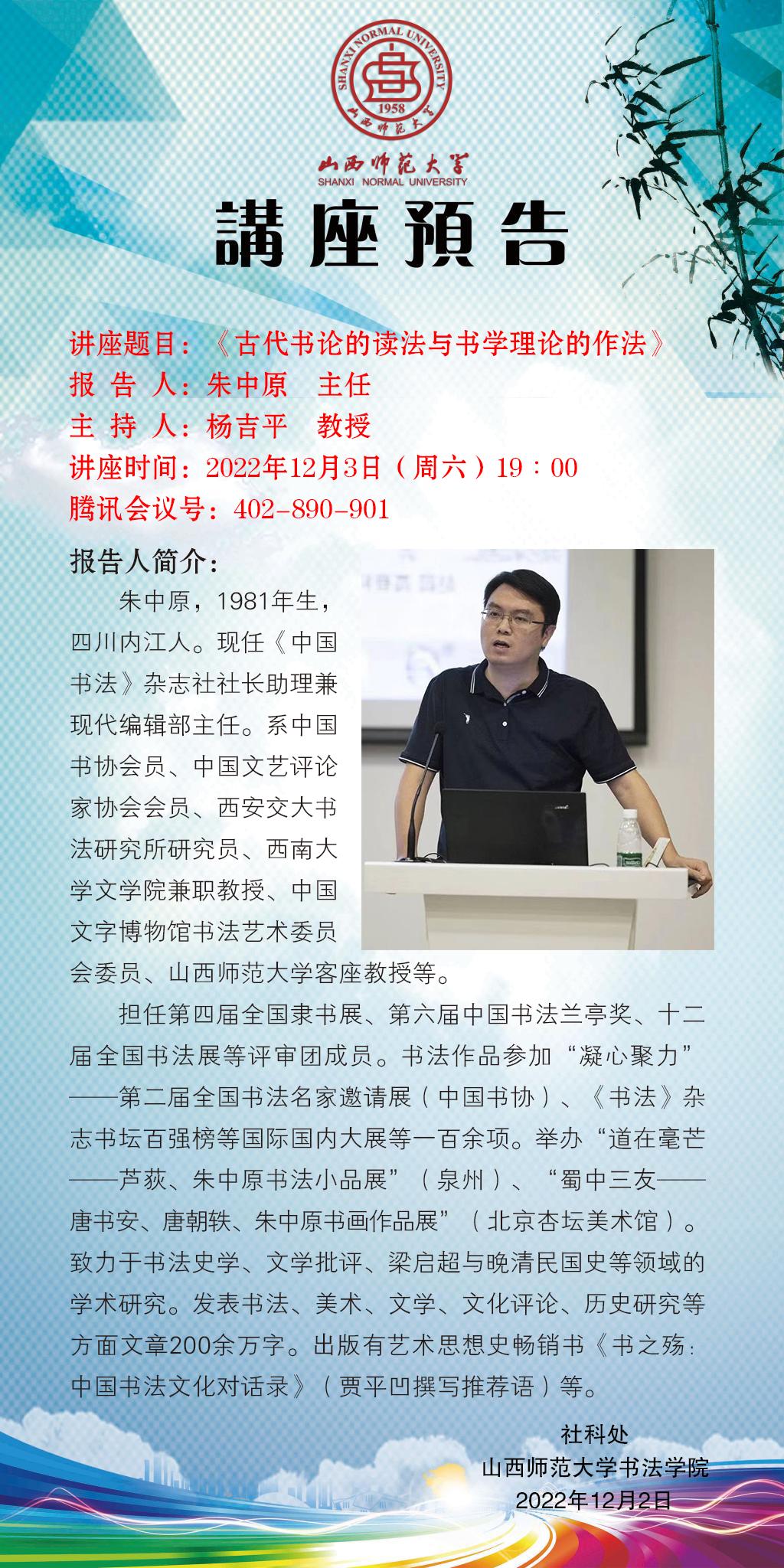 【预告】《中国书法》杂志社社长助理朱中原应永利官网书法学院邀请作线上学术报告