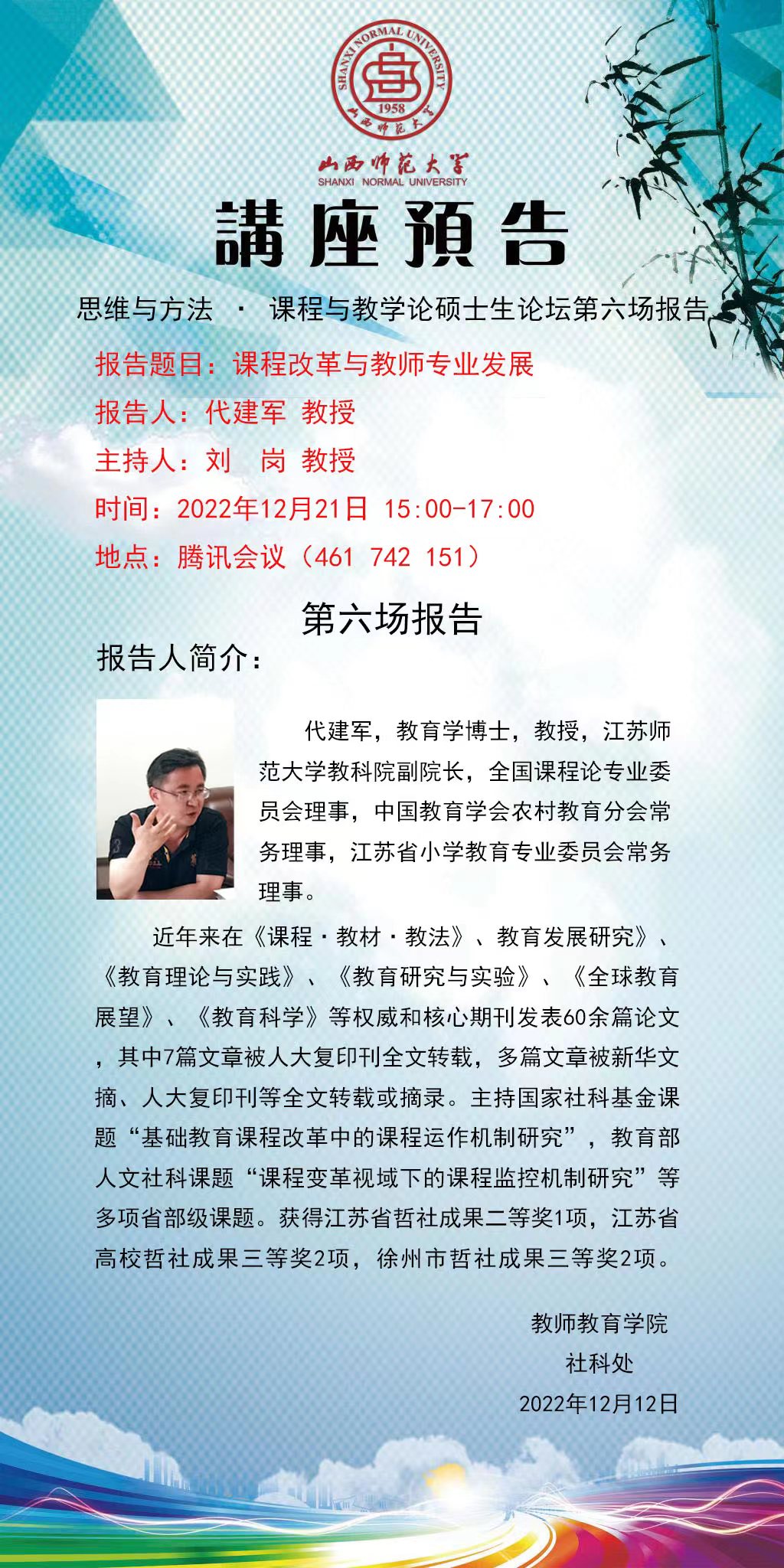 【预告】江苏师范大学教授代建军应教师教育学院邀请作学术报告