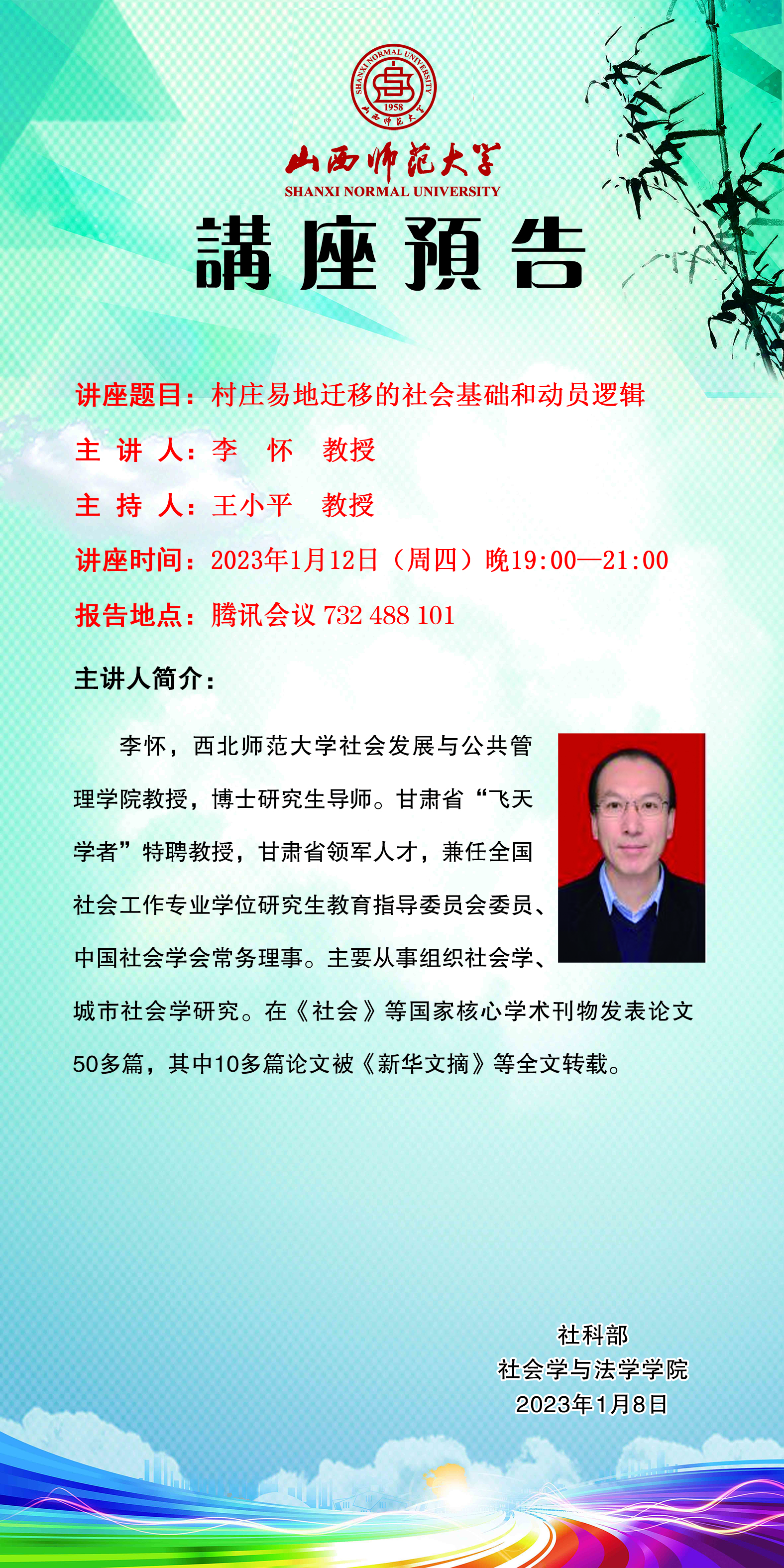 【预告】西北师范大学教授李怀应永利官网社会学与法学学院邀请作线上学术报告