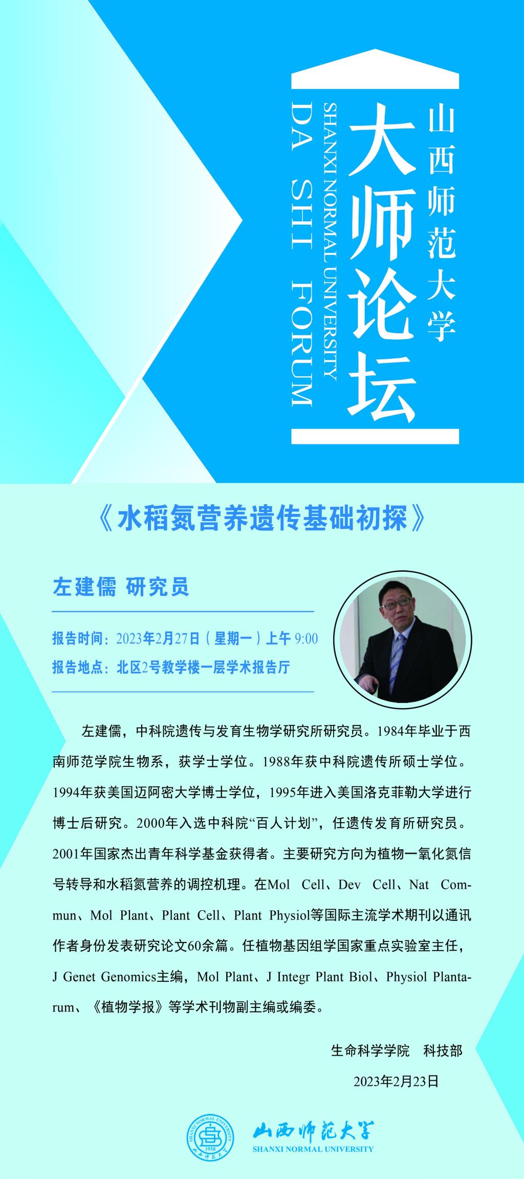 【大师论坛】中国科学院遗传与发育生物学研究所左建儒研究员应永利官网邀请作学术报告